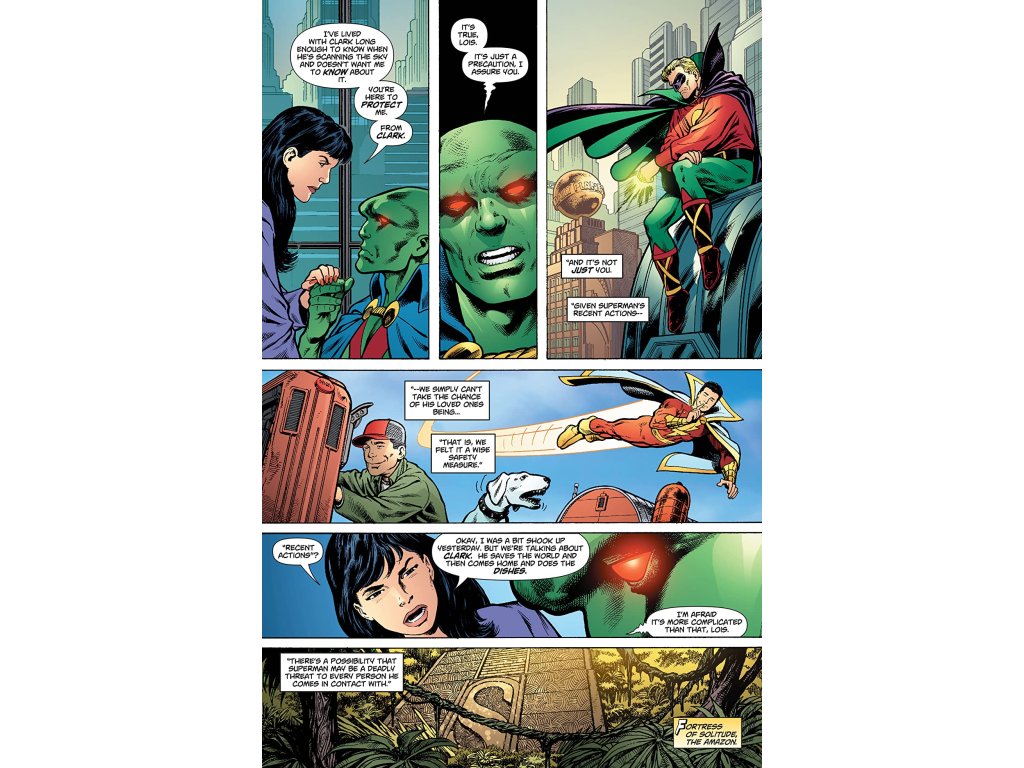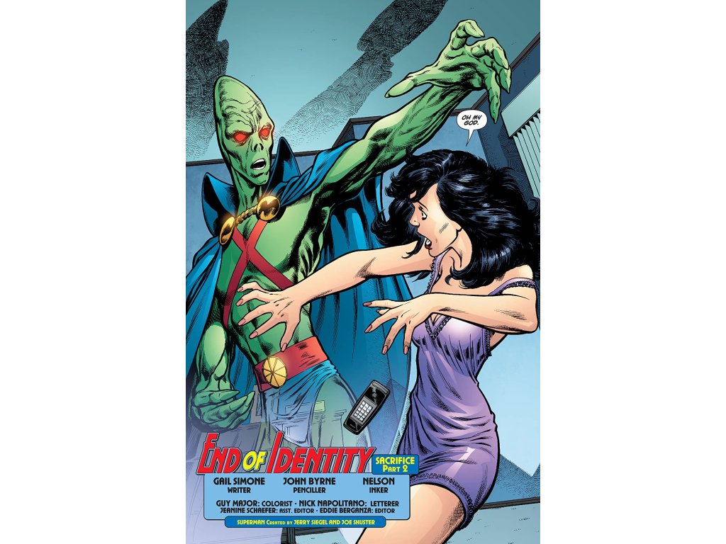 In the tie-in issue for the OMAC project, Martian Manhunter appears to Lois Lane to protect her from Superman. But what has Superman done that warrants this. As John Stewart, Hawkman, Black Canary and The Flash try to get Superman to come with them, a dazed and confused Superman doesn't understand what is happening, why are his friends cornering him and just whose blood is on Superman's hands? Gail Simone answers these questions as John Byrne draws in this issue that ends with a stunning revelation that could change the world forever.