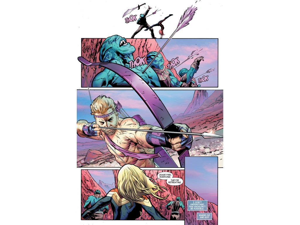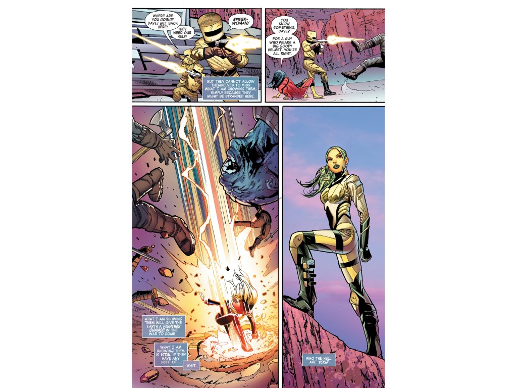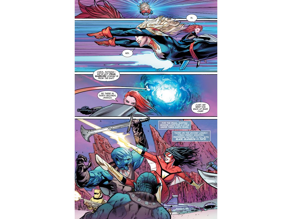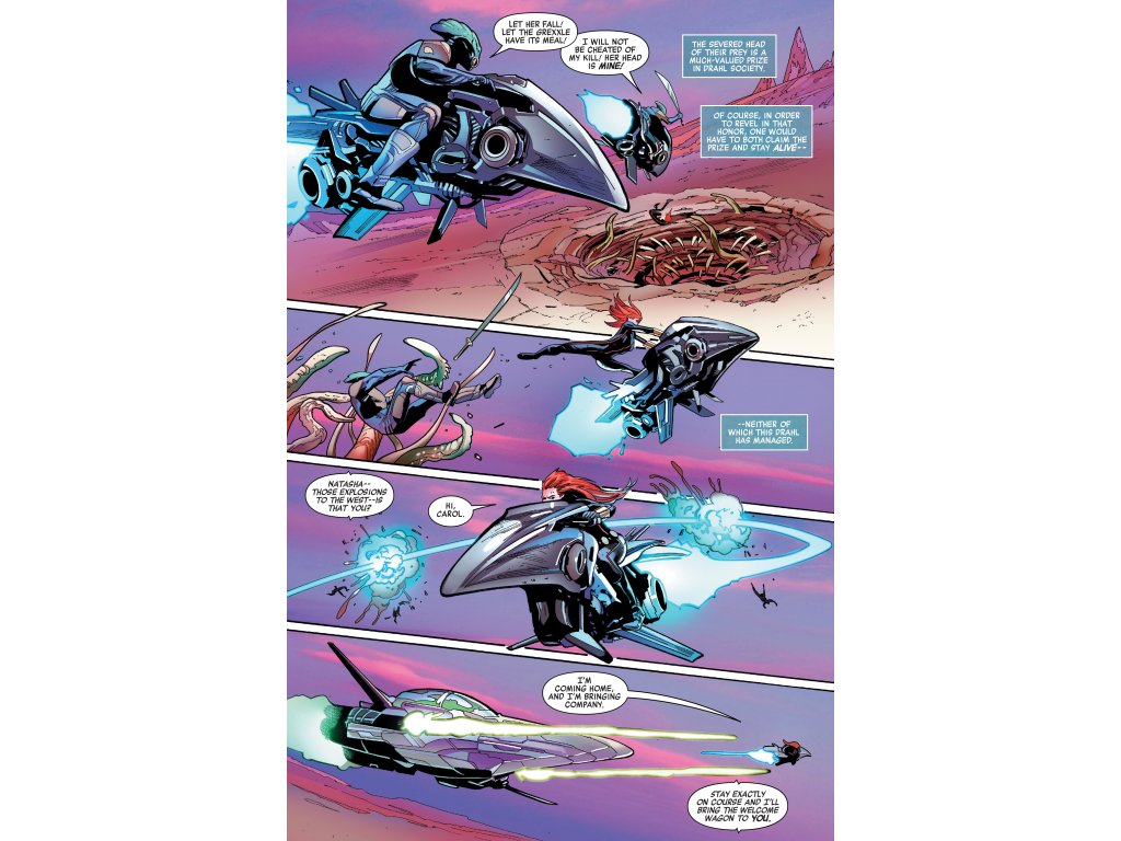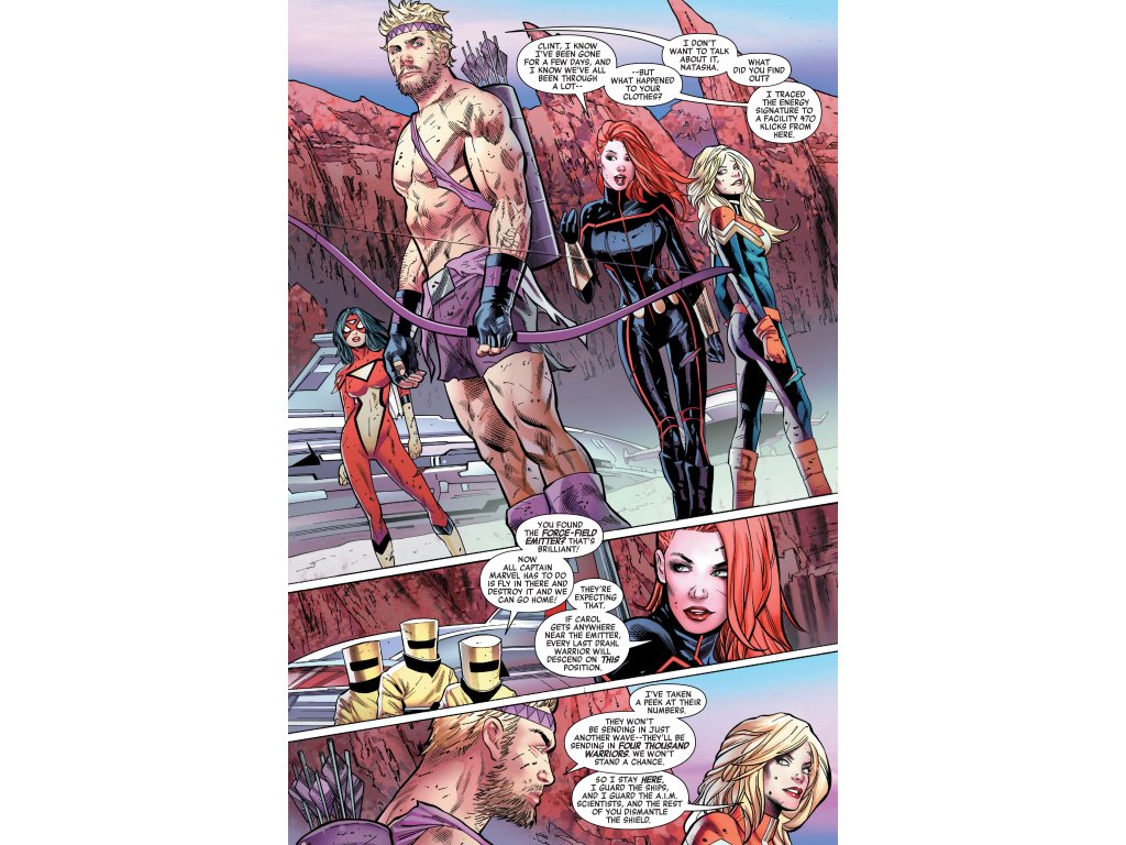 THE ACTION DOESN'T STOP FROM PAGE ONE! Trapped on an alien world and surrounded by bloodthirsty hunters, Black Widow, Captain Marvel, Spider-Woman and Hawkeye have only hours before their last chance to get home disappears forever. But as a new enemy watches from the shadows, it becomes clear that they were stranded here for a reason. They just have to figure out what it is before they are killed...