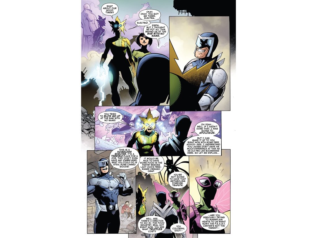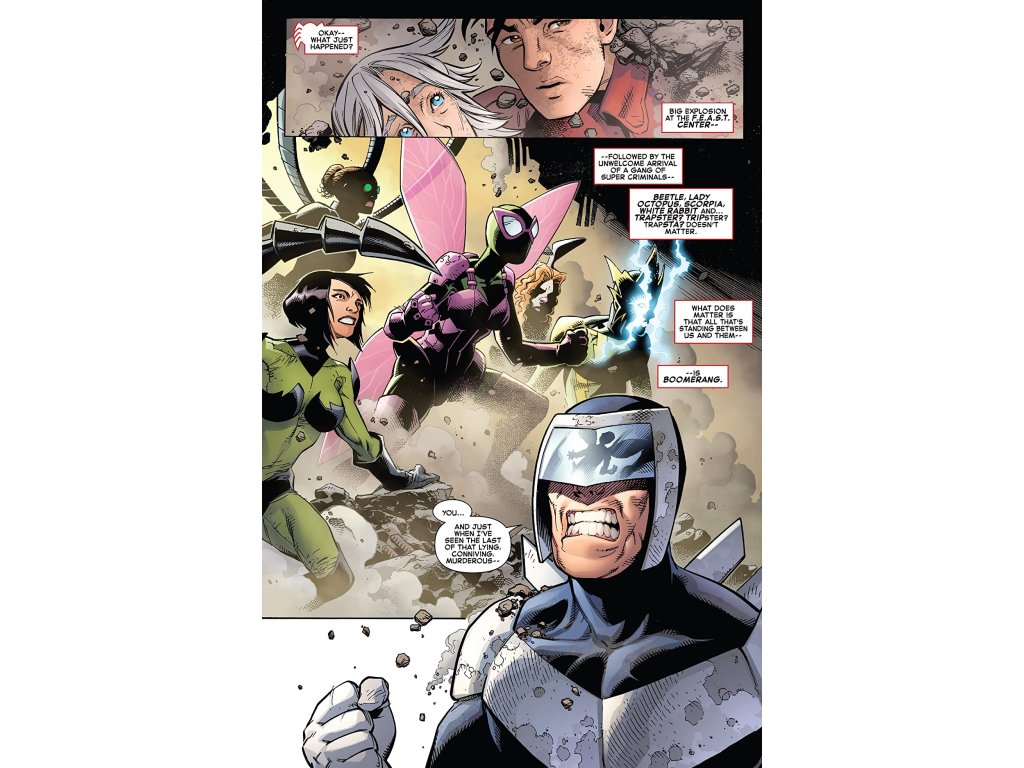 There is a new Sinister Syndicate! Beetle, Electro, Lady Octopus, Scorpia and White Rabbit have come together for one reason: TO HUNT BOOMERANG! Spidey knew having Boomerang as a roommate would come back to bite him, but not like this...