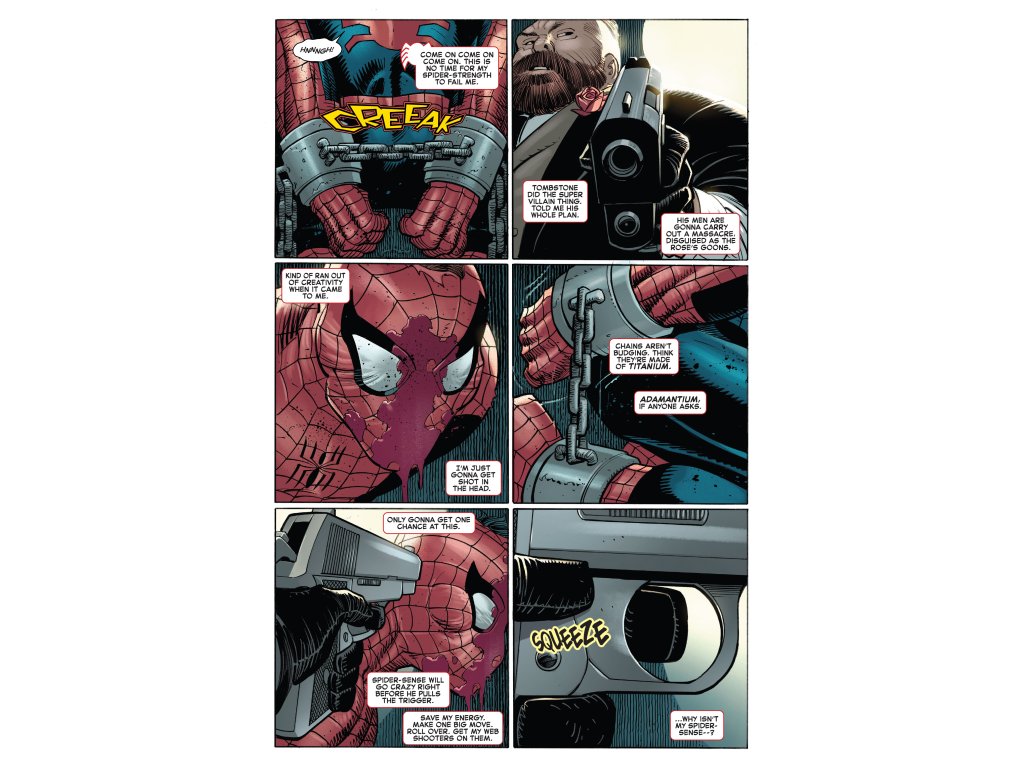 After what just happened with Tombstone, Spider-Man still has to fight a whole well-armed gang to save dozens of innocent New Yorkers. With his spider-powers, he can probably take ten or fifteen of them, right? What if there's thirty of them? ASM #900 is almost here!