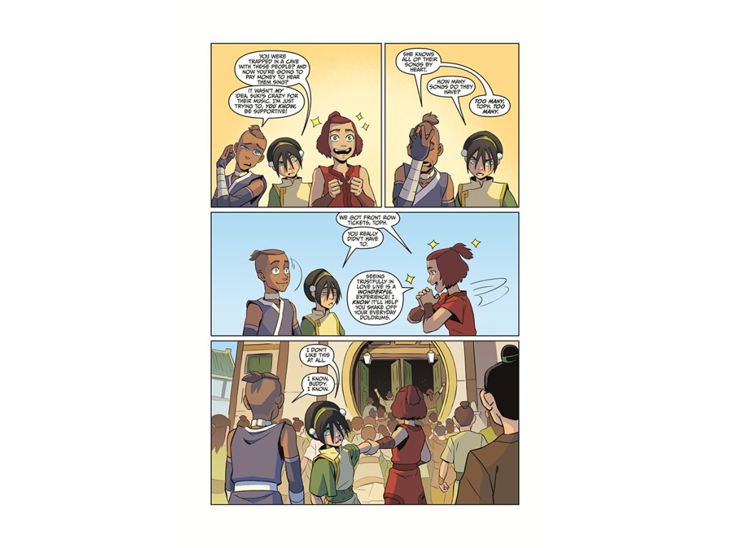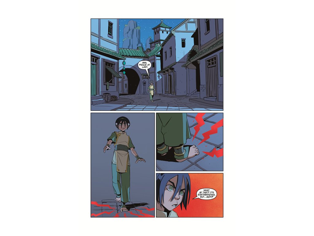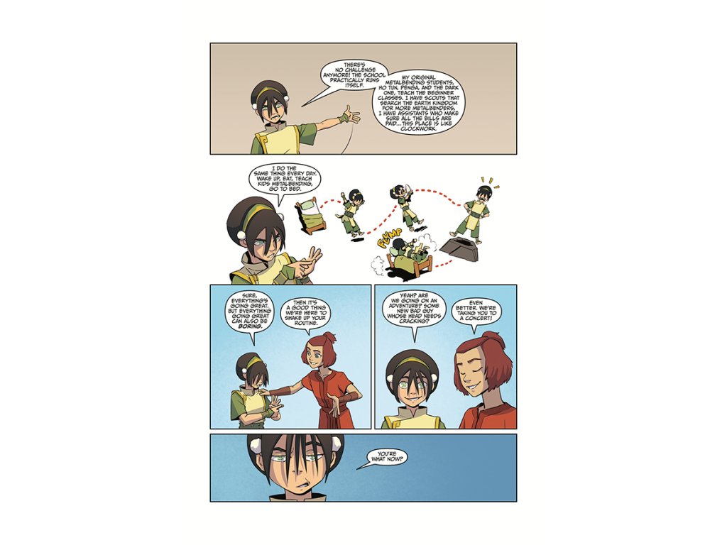 Things are looking bright at the Beifong Metalbending Academy! But after all the adventures Toph's had with Aang, Sokka, Zuko, and Katara, the whole thing feels a bit dull. Luckily, Sokka and Suki come to visit and reintroduce some familiar faces from their wandering days. And while out and about to celebrate, Toph discovers something that just might put the sparkle back in her eye. . .