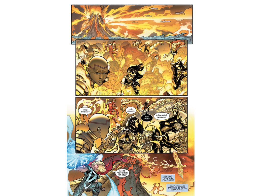 PLANETY SPALUJÍCÍ KOSMICKÝ SÍLA známá jako Phoenix se vrátila, a Avengers se proto musí zapojit do celosvětové bitvy o ultimátní moc! Ve vzdálené minulosti jeden milión let před naším letopočtem se mladá dívka provinila pouze tím, že se narodila s rudými vlasy, a její osud navždy změní dějiny lidstva! V přítomnosti si mezitím Phoenix hledá nového hostitele a pro ty, které si vyhlédla, mocné hrdiny i padouchy marvelovského světa, uspořádá nelítostný, krvavý turnaj. Zatímco se rozhoduje o vítězi, Thor vede Avengers v boji proti samotné Phoenix, ale vše se zkomplikuje – náhle se totiž odhalí netušené pouto Boha hromu s ohnivým kosmickým létavcem! Bonus: Blade po boji proti Králi v černém zaplatí temnou daň.