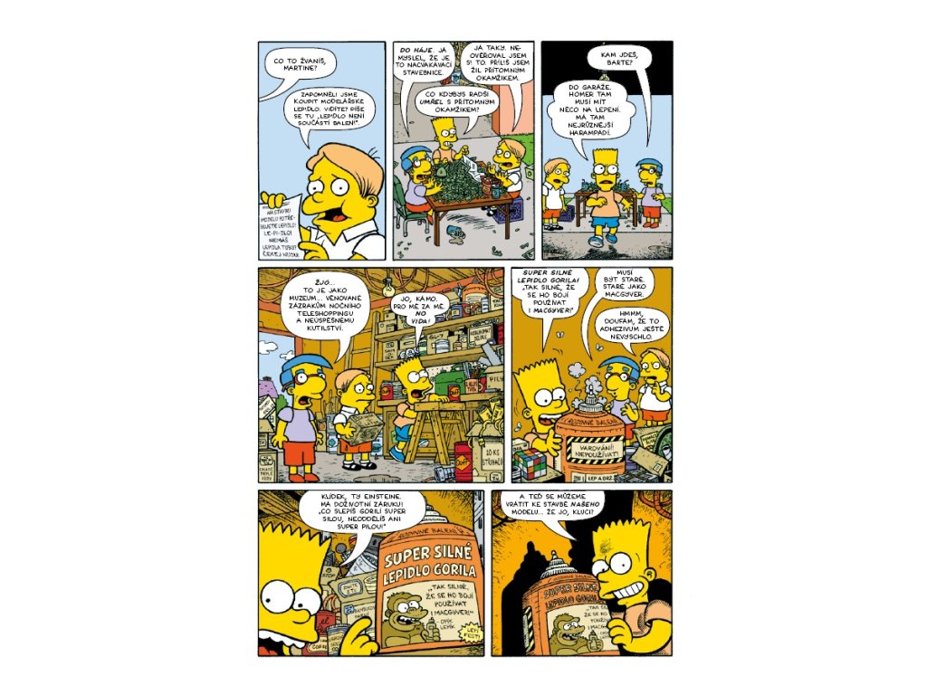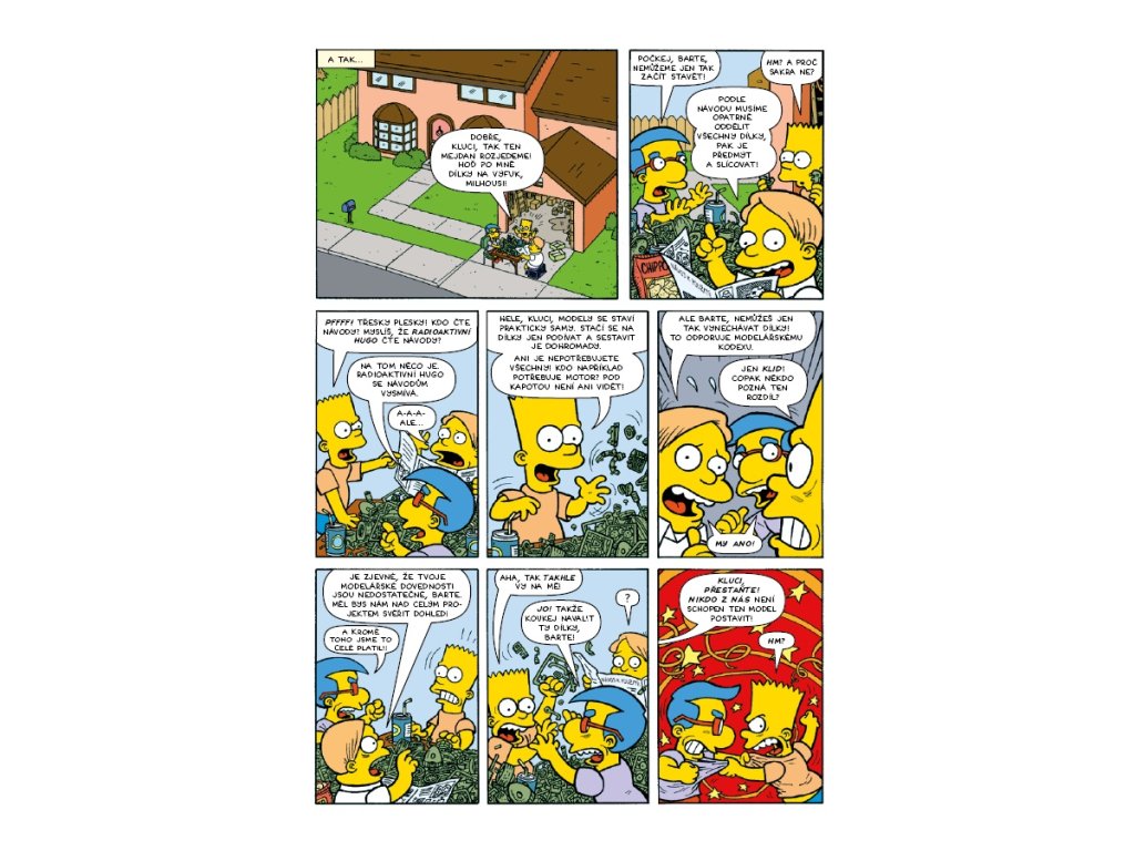 Bart a spol. si pořídí model káry Radioaktivního Huga. Jenže se musí slepit. Což je v rukou šikovných lidí hračka, v rukou Barta katastrofa. A co teprve, až se pustí do sprejové bitvy s... ředitelem Skinnerem? Komiks, který vám přilepí úsměv k obličeji!