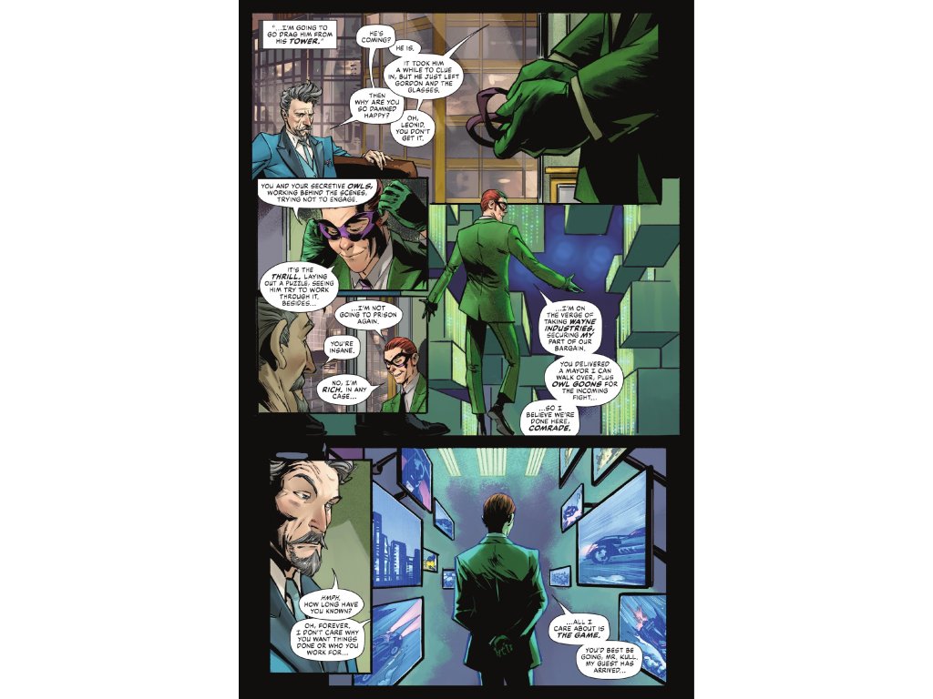 THE RIDDLER'S PLANS FINALLY REVEALED! The GCPD is closing in on their suspected killer — and on Batman! Wayne Enterprises is under attack as Nygma's plans come into focus. The Owls are not what they seem. Don't miss the thrilling penultimate issue of "The Dying City"!