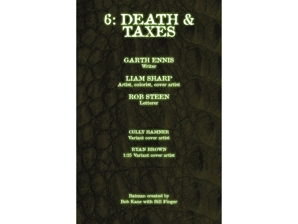 Batman and Killer Croc face off against Croc’s murderous offspring in a finale that has to be seen to be believed. The World’s Greatest Detective closes the world’s strangest case in the final issue of Garth Ennis and Liam Sharp’s twisted tale.
