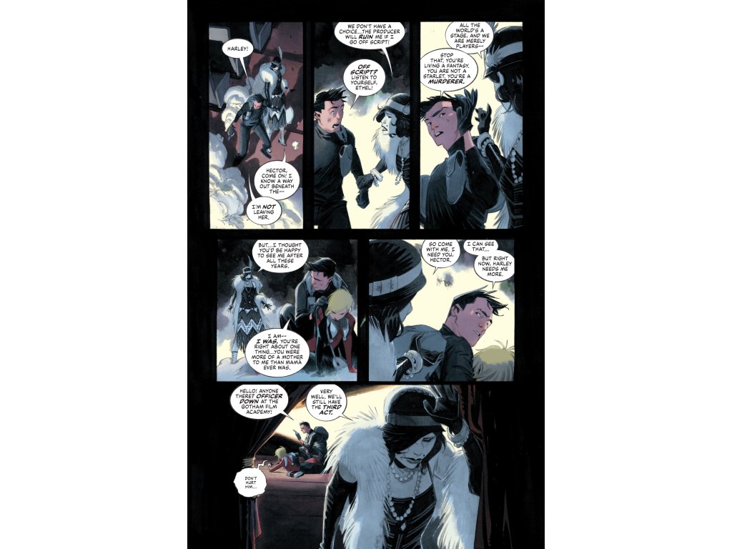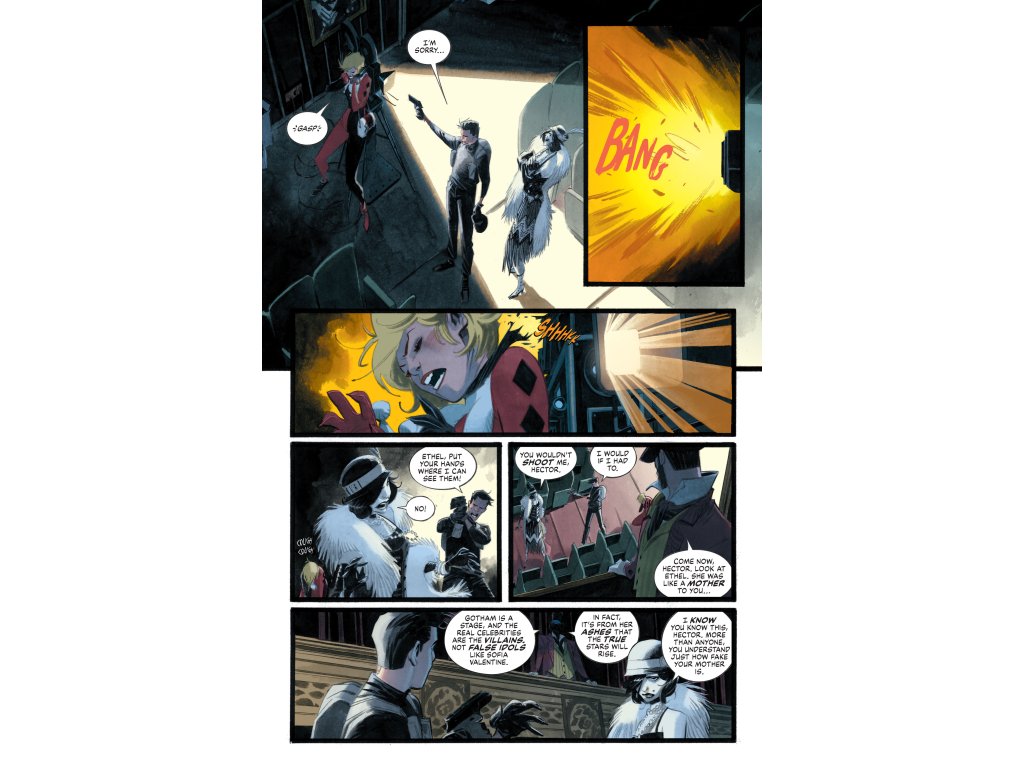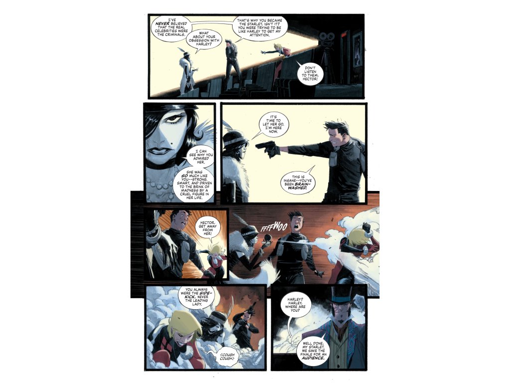 The Producer’s scheme is in motion, and the GTO is on high alert as Gotham’s hope of a peaceful new horizon begins to collapse. Rattled and recovering from a close encounter with Starlet, Harley examines whether her complicated past with villainy is a burden or a boon to her new identity. She weighs two final options: break all ties and retire to a quiet life, or embrace the chaos, risk, and responsibility of protecting the people and the place that created her. The choice itself may be fantasy, as a targeted attack on Harley ends in tragedy and drives Bruce to a reckless decision that could extend his prison sentence indefinitely.