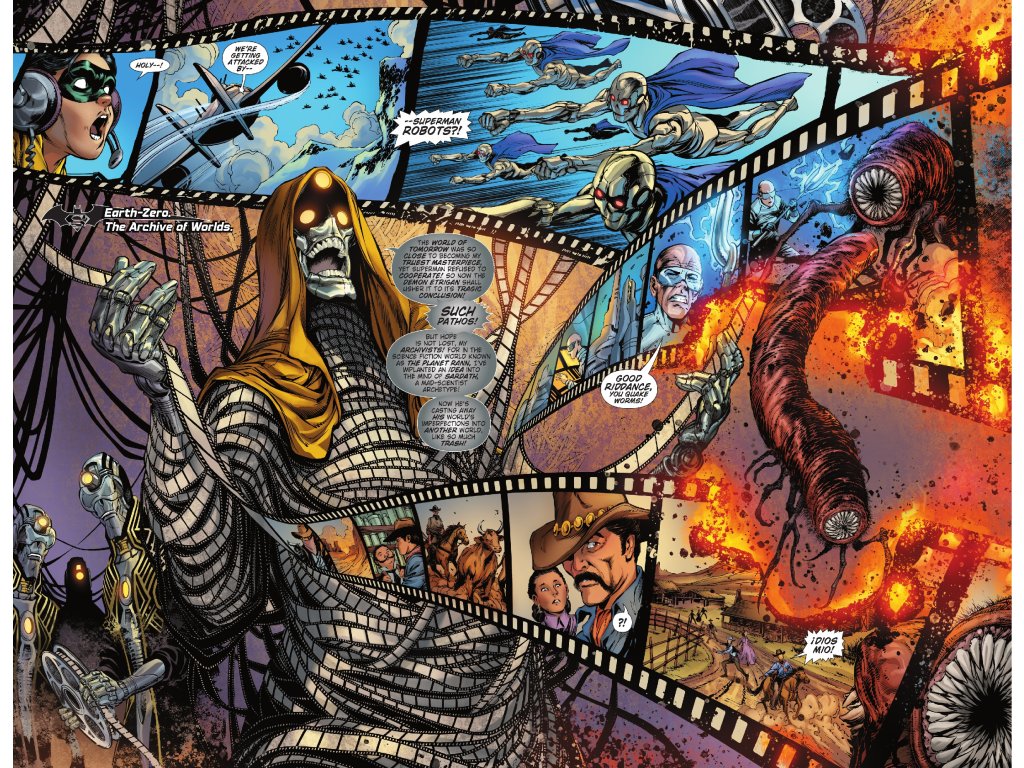 The dimension-shattering Archive of Worlds saga ends here—and reverberations from this titanic tale last long after the dust settles! As the Dark Knight and the Man of Steel work to halt the villainous Auteur.io’s plan here on Earth-0, the Batman and Superman of their respective archive worlds must team up with Alanna of Rann and El Diablo himself to save what’s left of their homes. Etrigan and his demon hordes rain Armageddon down on their pocket universes—and the fate of the World of Tomorrow and the World of the Knight hang in the balance!