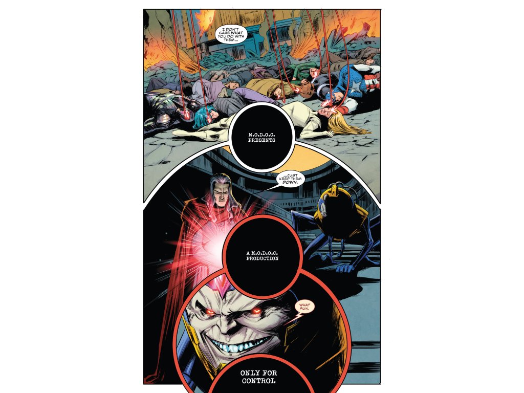 CAPTURED! Captain America and the new Invaders are caught in the excruciating clutches of M.O.D.O.C., the Mental Organism Designed Only for Control. Can they escape before the Outer Circle completes its takeover of Manhattan—and acquires a weapon that could change the course of history? No matter what, one of them won’t make it out alive…