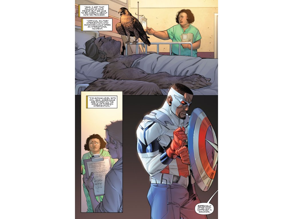 "PAX MOHANNDA" STARTS HERE! Still reeling from his conflict with Wakanda, Sam Wilson is called to the international stage once again to protect a visiting politician from the African nation of Mohannda. But the White Wolf has already put the second stage of his plan into motion, with dire consequences for both Sam's closest friends…and Mohannda. Old allies return and new enemies rise in this thrilling new chapter of CAPTAIN AMERICA: SYMBOL OF TRUTH!