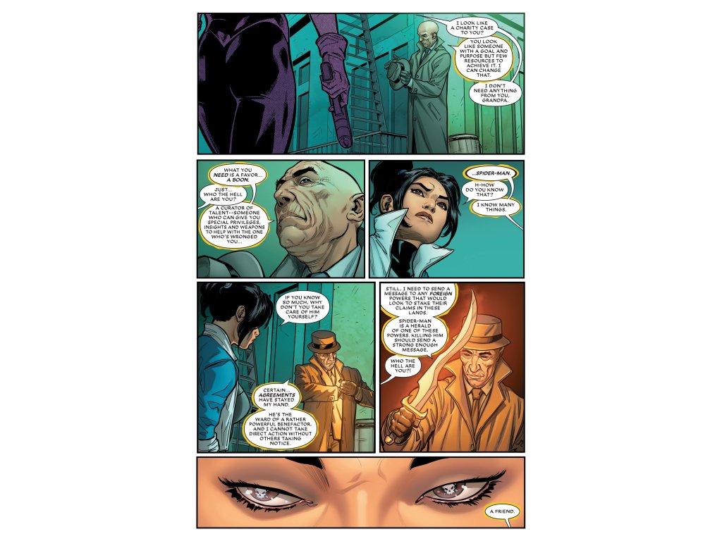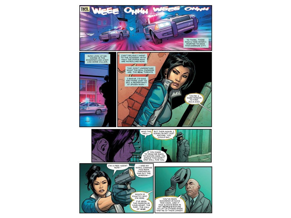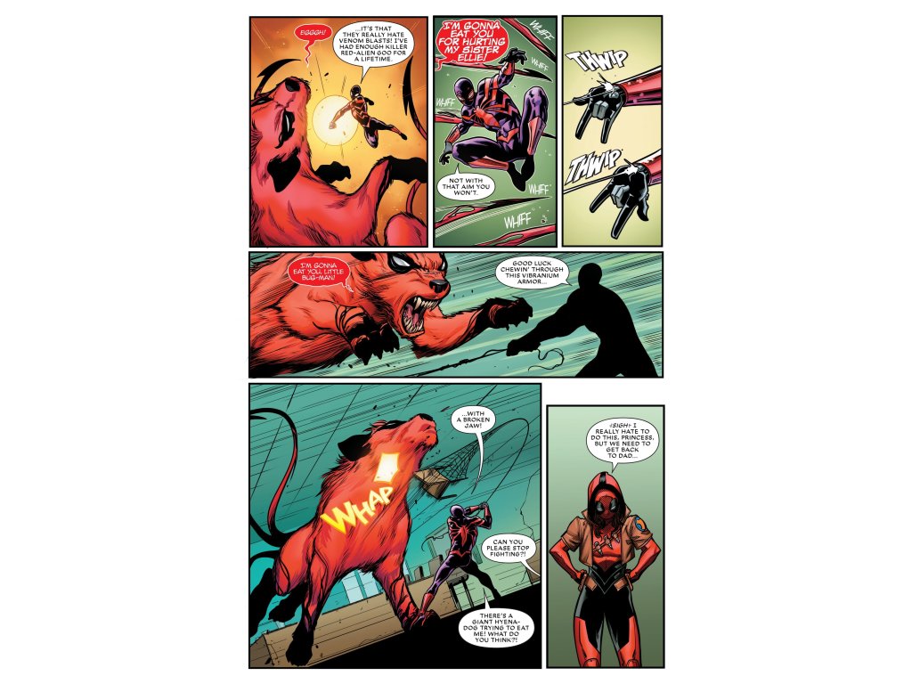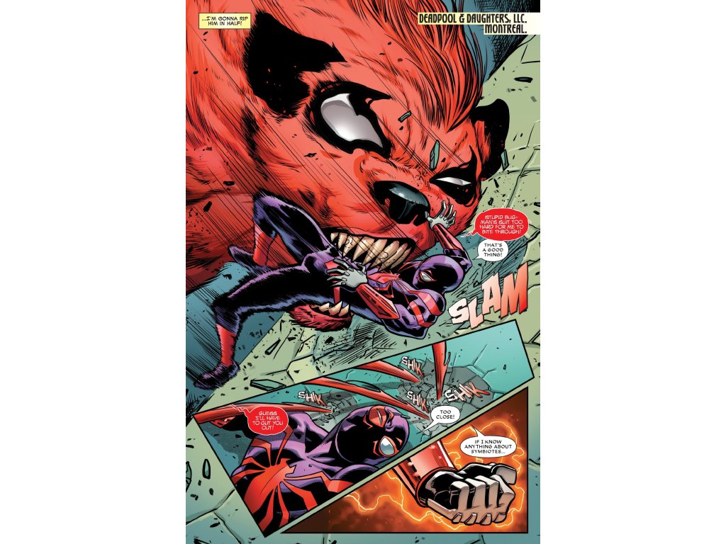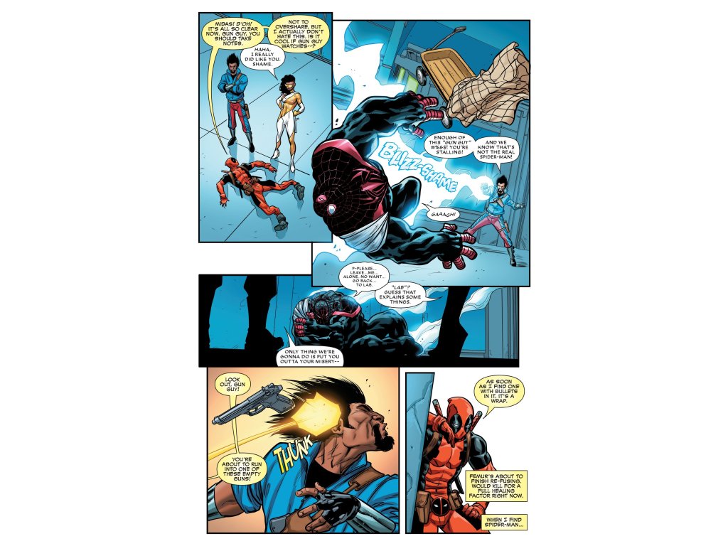 SPIDER-MAN VS. DEADPOOL(S) — whoever wins... well, some bad #$%& is still going to happen! WADE's only hope is to knock out MILES. ELLIE is having second thoughts. But can the Deadpools and their business survive without this win? Not if AGENT GAO has anything to say about it!