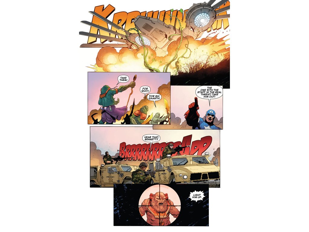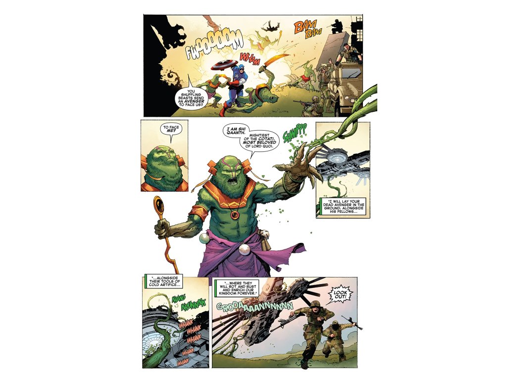 When the united Kree/Skrull army targets Earth, Captain America sends out a call for heroes! But which Avengers will stand to fight a war on three fronts? Old favorites like Scarlet Witch and the Black Knight will join new faces including Ka-Zar, Zabu and…the Man-Thing?! In New York, a villain from the past is supercharged with alien energy! In Mexico, old hatreds turn allies into enemies! And in the Savage Land, the soul of the jungle has been stolen — and Shanna the She-Devil’s life hangs in the balance! Meanwhile, Cap himself stands on the front lines! With his back against the ropes, Steve Rogers reaches out for aid — but is there anyone left to battle by his side? Prepare for mystery, magic and mayhem in the Mighty Marvel Manner — Avengers Assemble!