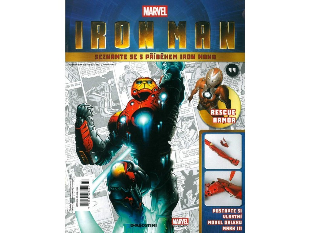 Odhalte vše o jednom z nejznámějších hrdinů světa Marvel v jedinečné kolekci. Ponořte se do jednotlivých čísel časopisu a prožijte znovu všechna Iron Manova dobrodružství od jeho začátku až po současnost a sestavte si legendární oblek Tonyho Starka. Tento model s názvem Mark III ve velkém měřítku je nevídaně propracovaný, dokonale ohebný, a je navíc vybaven funkčními LED světly. Vychází v limitované edici, kterou si žádný fanoušek světa Marvel nemůže nechat ujít.