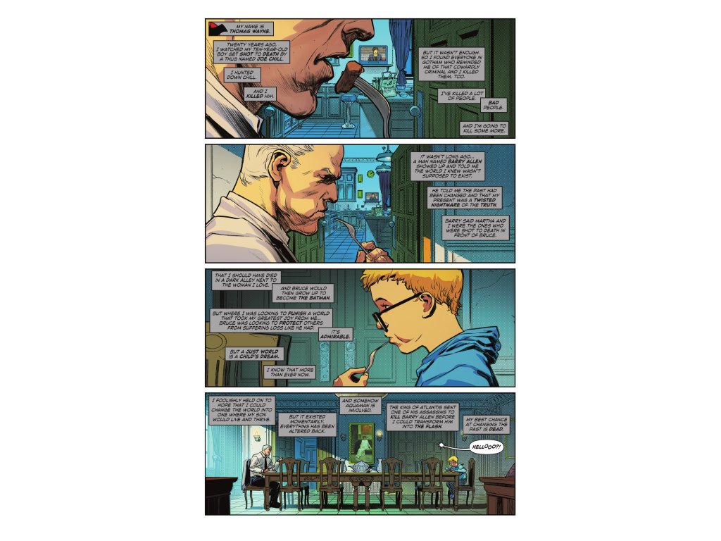 Batman’s hunt for the Clockwork Killer brings him to Europe and face to face with the mad king, Aquaman. On the eve of Aquaman’s sinking of London, Batman infiltrates his stronghold and goes on the warpath for answers. Nothing matters to Batman, whose world is already dead, but if he can track down the Clockwork Killer, Thomas can save his son’s world and put everything back together again.