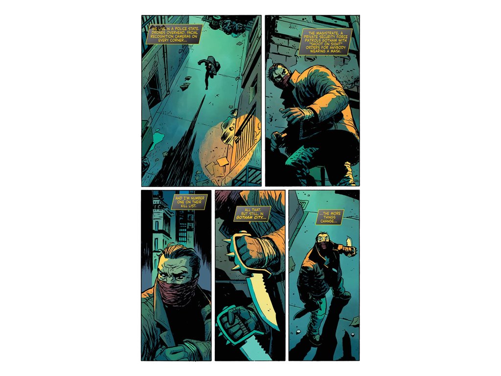 Gotham City has always been dangerous-but now, it’s downright deadly! Following the tragedy of “A-Day,” the mayor allowed the private law enforcement group known as the Magistrate to take over policing so-called mask crime-and that has given rise to a new Dark Knight! What is this mysterious crime fighter’s connection to former Batman weaponeer Lucius Fox? The fight for justice has never been this dangerous!