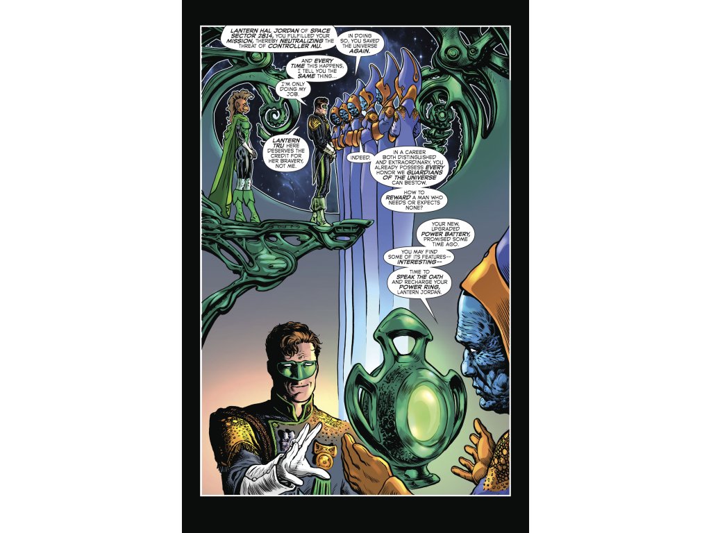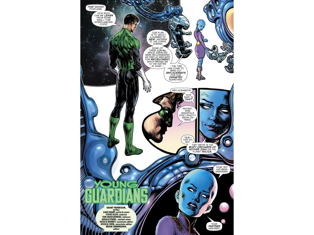 The team of writer Grant Morrison and artist Liam Sharp continue their bold new take on the Emerald Warrior in a wild 30-page second season opener! In the wake of the Blackstar incursion, Hal Jordan and his fellow Lanterns must pick up the pieces from that cataclysmic conclusion. Among them is Jordan’s next critical mission: search for the next generation of cosmic immortals. Is the universe ready for…the Young Guardians?