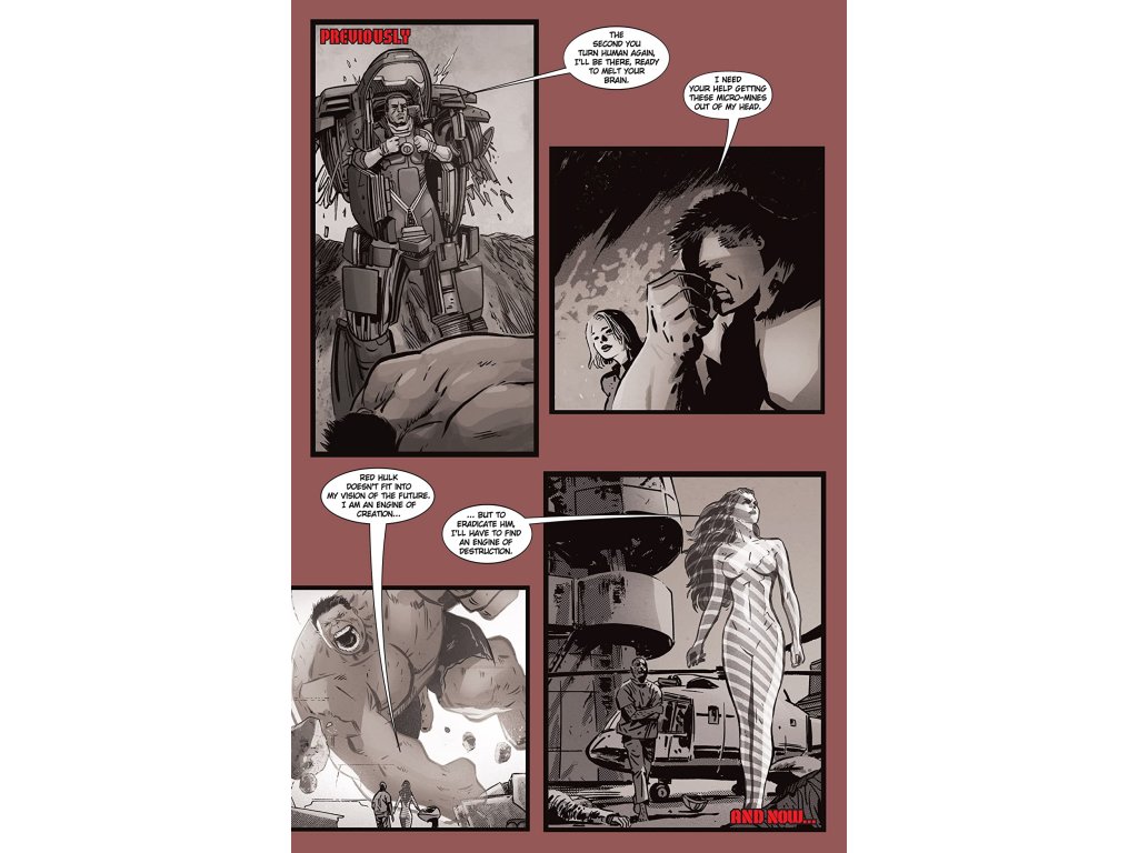 The Red Hulk has nowhere to call home. He can't sleep or he'll run the risk of turning human and be killed by General Fortean. The Red Hulk needs time and answers; instead he gets another unstoppable hunter created by Zero/One just for him!