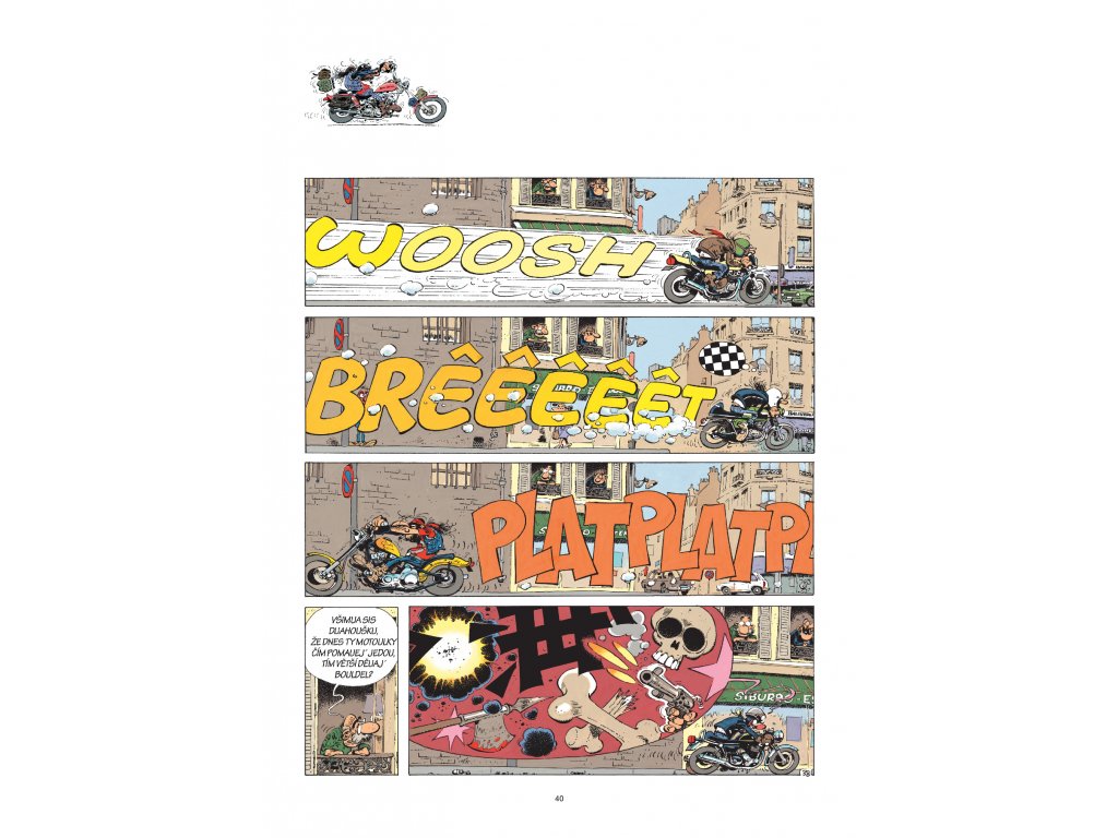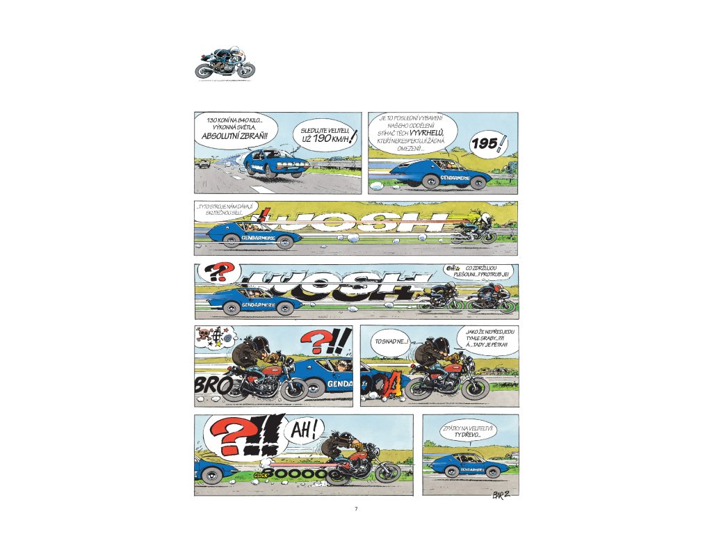 Motocyklový kultovní komiks JoeBarTeam přináší vtipné příběhy ze života party bikerů. Perfektní ilustrace příhod, které se stávají skoro každému. Setkáte se i s těmito legendárními stroji: Honda CB 750 café, Ducati 900 SS, Kawasaki 750 H2, Norton Commando 850, Moto Guzzi California, BMW R90/6 Interceptor, Vespa 125PX, dragsterem HD… Poučíte se o palivech jako nitroglycerinmethanol nebo burn-out koktejl. Probere se teorie smyku na mokru, mladý Jean odjede svůj první závod a několikrát se střetneme s policií, harleyáři i technickými problémy.