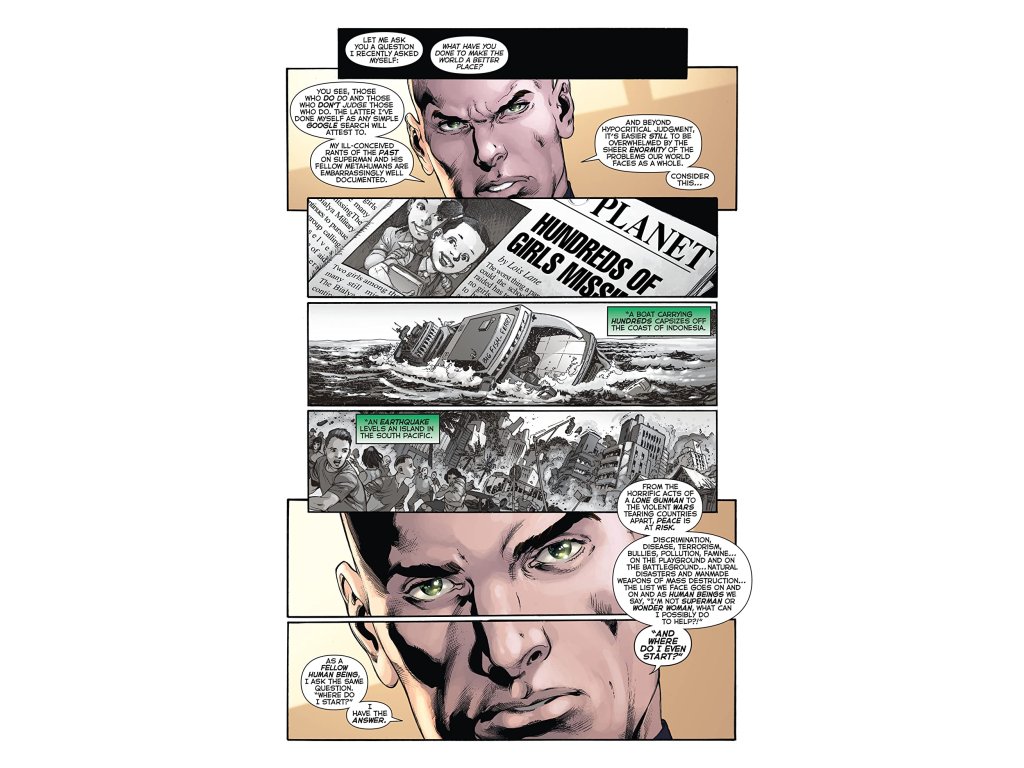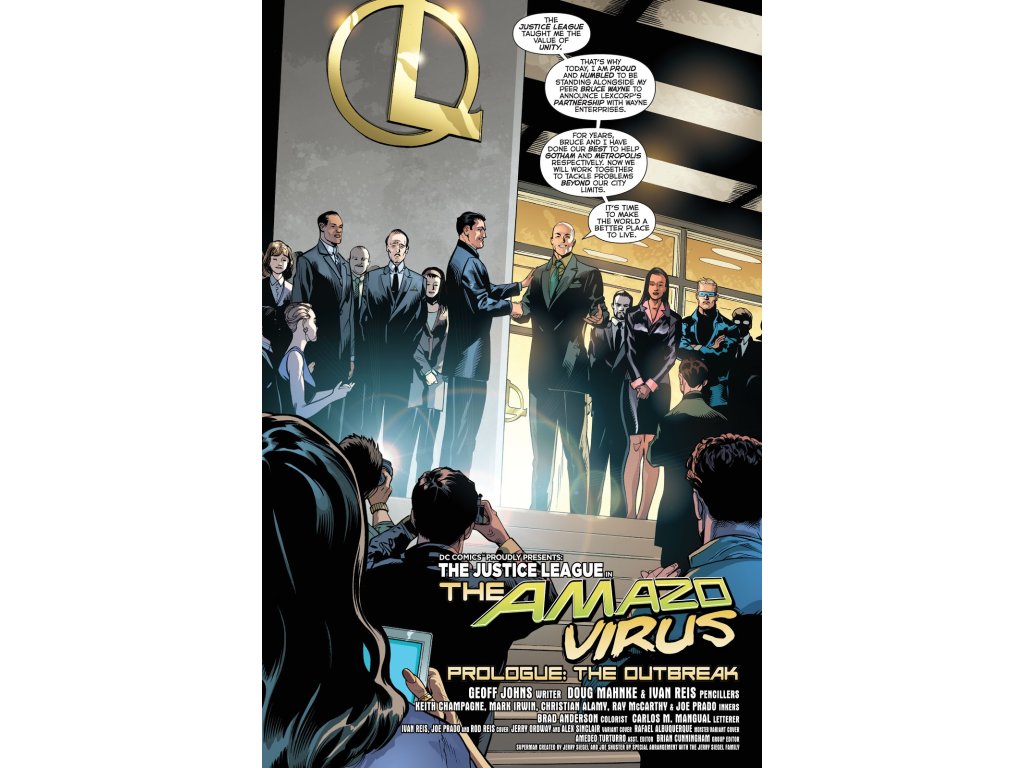 "THE AMAZO VIRUS" begins here! Bruce Wayne and Lex Luthor join Wayne Enterprises and LexCorp—but why? And then, it's HUMAN VS. SUPER-HUMAN when a dangerous and bizarre virus is unleashed upon the Justice League—but what exactly is the Amazo Virus? Who unleashed it and why? And what unforeseen effects will it have on the greatest heroes of the DC Universe? Plus, Batman and the League uncover Lex's most guarded secret at Lexcorp Headquarters.