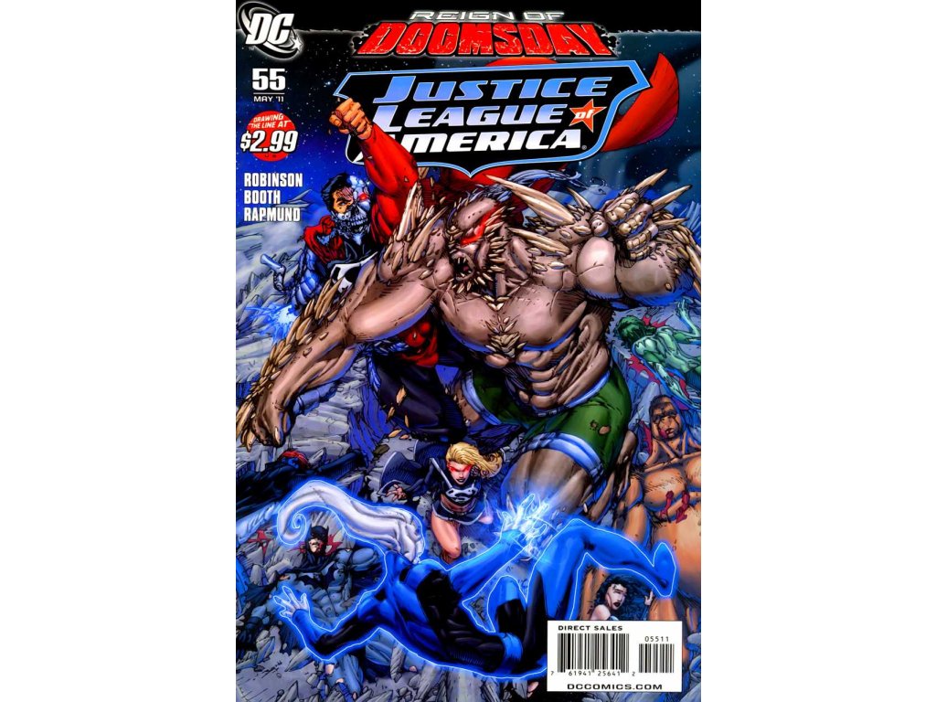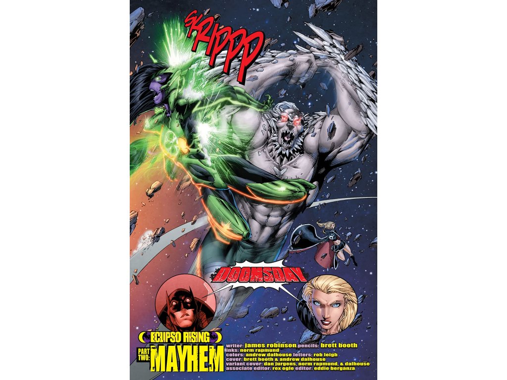 The Rise of Eclipso continues! With the Spectre fallen and darkness spread throughout the DC Universe, no one is safe from Eclipso's control! Not any of DCs shadow-based heroes and villains. Not Alan Scott and the magical beings of the moon's Emerald City. Not even the World's Greatest Heroes! And when Eclipso's ultimate goal is revealed, they'll see that it's scale is even bigger than the DC Universe. One lone hero has the power to make sure all be well however...for he has hope. Introducing Blue Lantern Saint Walker to the Justice League of America! In the remains of New Krypton, Doomsday tears through Batman, Supergirl and Alpha Lantern Boodikka in his search for Cyborg Superman as "Reign of Doomsday" rampages on!