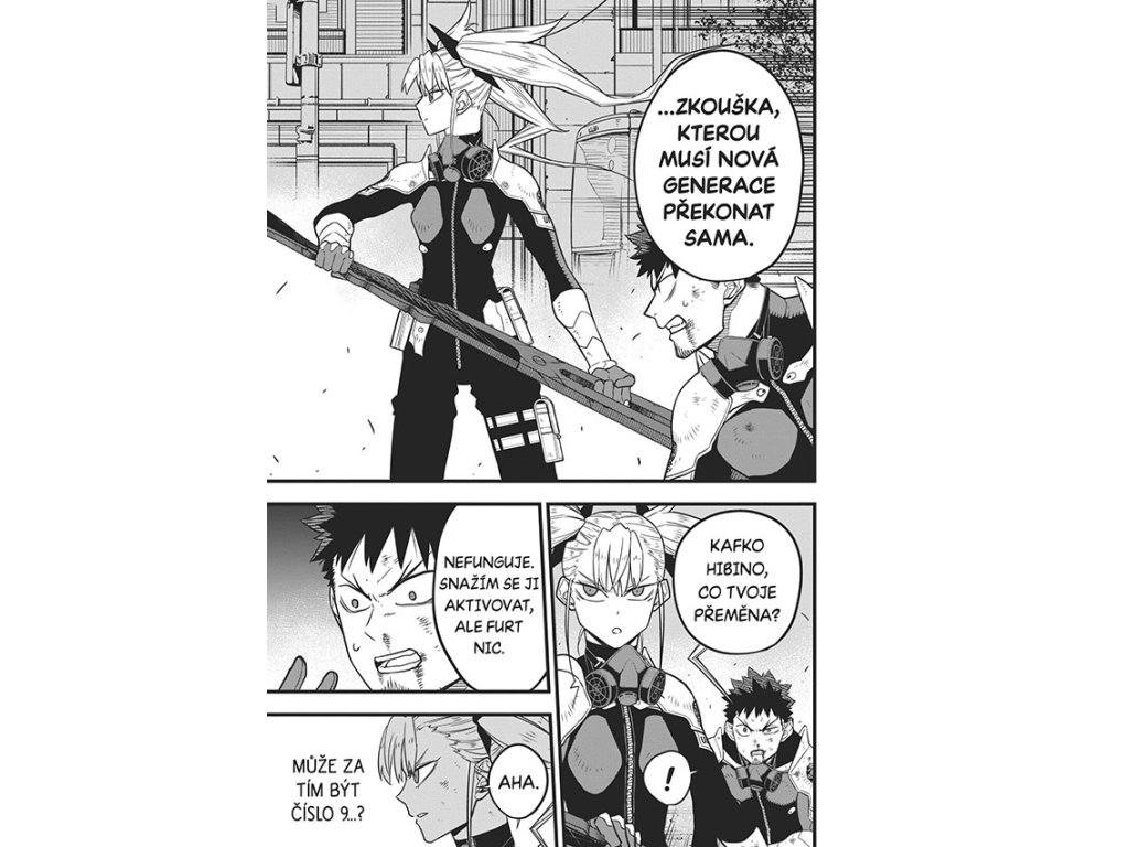 Neočekávané střetnutí s Nestvůrou číslo 9 postavilo Kafku před problém, jakému dosud nikdy nemusel čelit – jeho schopnost přeměny vypověděla službu. I když Kafka díky rychlému zásahu Kikoru vyvázl živý, stále ještě nemají vyhráno. Jejich nepřítel je silný a není sám – identická kopie Čísla 9 se totiž zjevila i před kapitánem Narumim!