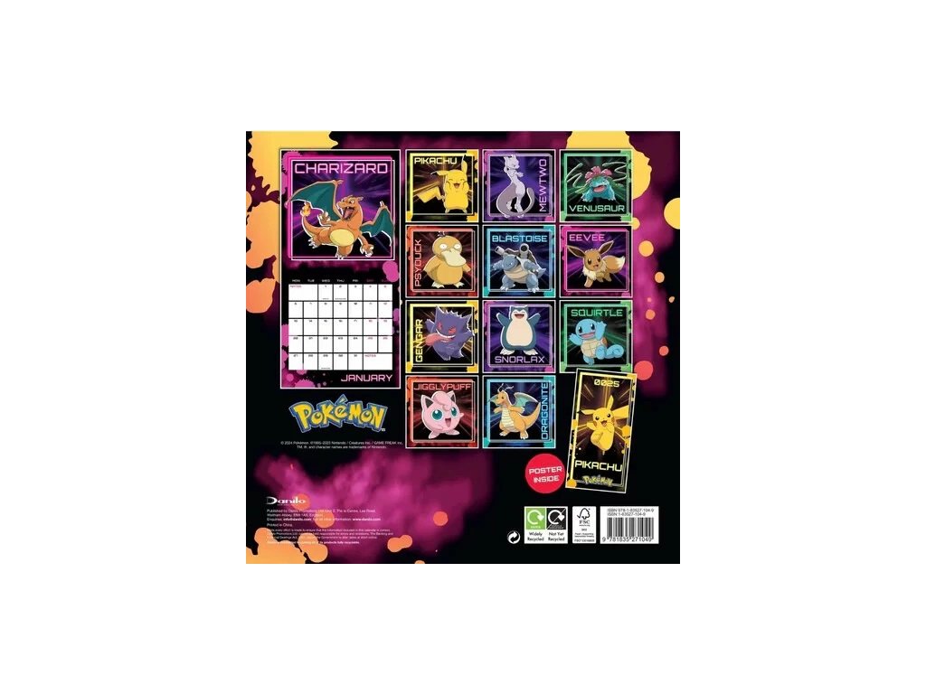 Oficiální dvanácti měsíční nástěnný kalendář s Pokémony pro rok 2025 o velikosti 30 x 30 cm ve složeném stavu (30 x 60 cm v rozloženém formátu). Kalendář 12 obrázků.