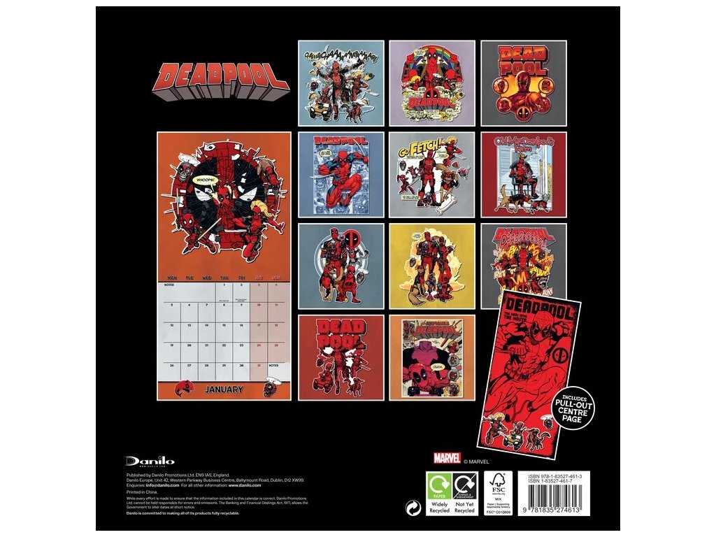 Oficiální dvanácti měsíční nástěnný kalendář Deadpool 2026 o velikosti 30 x 30 cm ve složeném stavu (30 x 60 cm v rozloženém formátu). Kalendář 12 obrázků a jeden bonusový plakát o rozměru 30 x 60 cm.