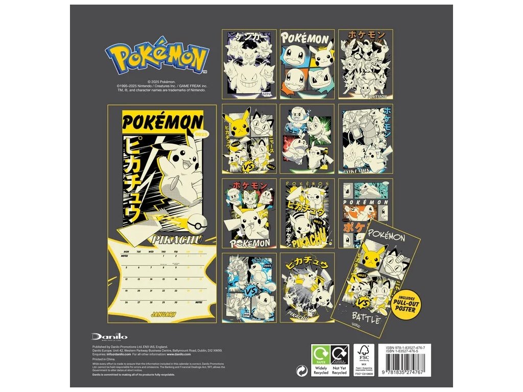 Oficiální dvanácti měsíční nástěnný kalendář s Pokémony pro rok 2026 o velikosti 30 x 30 cm ve složeném stavu (30 x 60 cm v rozloženém formátu). Kalendář 12 obrázků.