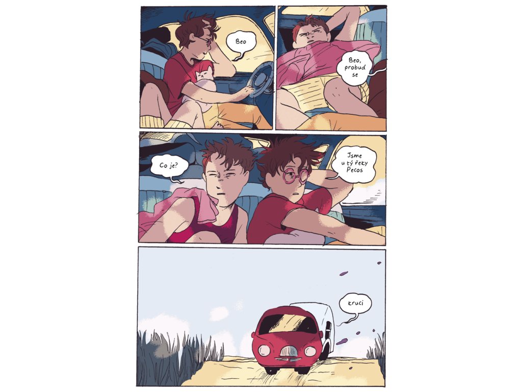 Dívka Bea je na útěku z domova, když potká automechaničku Lou. Náhodné setkání se ukáže jako osudové. Obě ženy nasedají do auta a pokouší se ujet před komplikovanými vztahy i traumaty. Bez ohledu na věkový rozdíl obě sdílejí podobné důvody k úniku. Bea je ještě dítě, Lou se pro ni stává průvodkyní, od které nehrozí odsuzování nebo nedůvěra. S tajemným kočičím společníkem putují krajinou, jež se s každým ujetým kilometrem čím dál víc mění v kouzelný prostor, ovšem i zde číhá nebezpečí v podobě podivných pronásledovatelů. Dojemná road movie se prolíná s prvky magického realismu a autorka skládá poctu svým vzorům v čele s Hajaem Mijazakim. Kdo se na tuto cestu do fantazie vydá, tomu zůstane v paměti ještě dlouho po otočení poslední nádherně nakreslené stránky.
