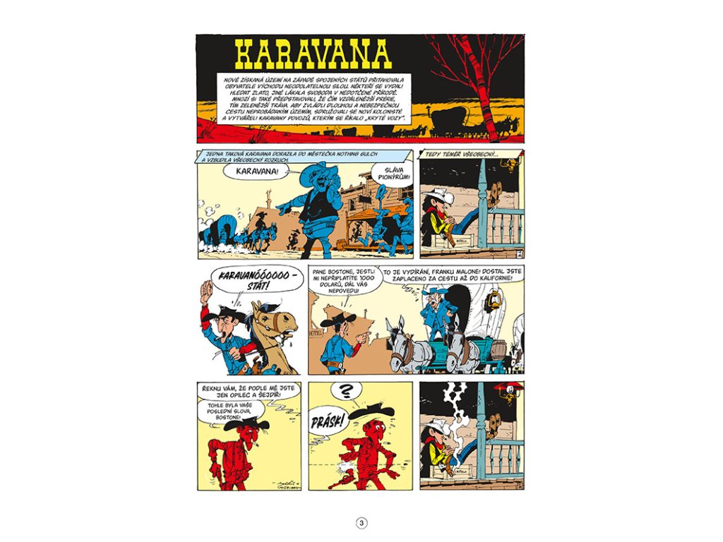 Cesta přes celé Spojené státy z východu až na západ je dlouhá a nebezpečná. Lucky Luke má však dobré srdce a rozhodne se doprovodit průkopníky až do Kalifornie. Karavana může vyrazit!