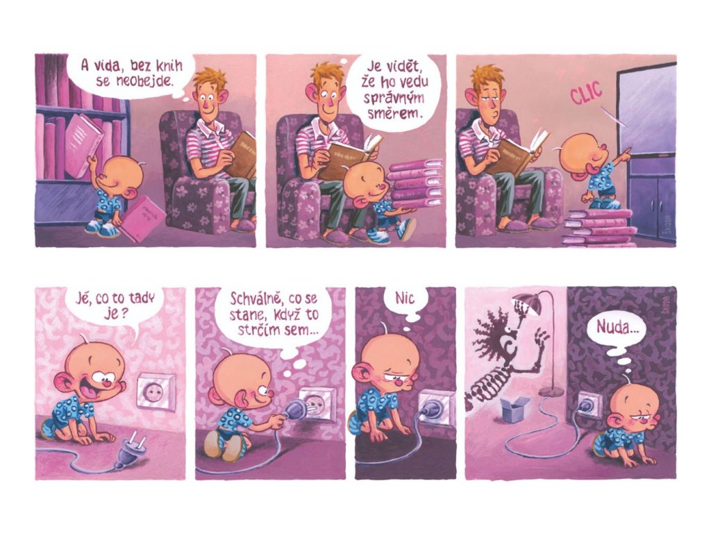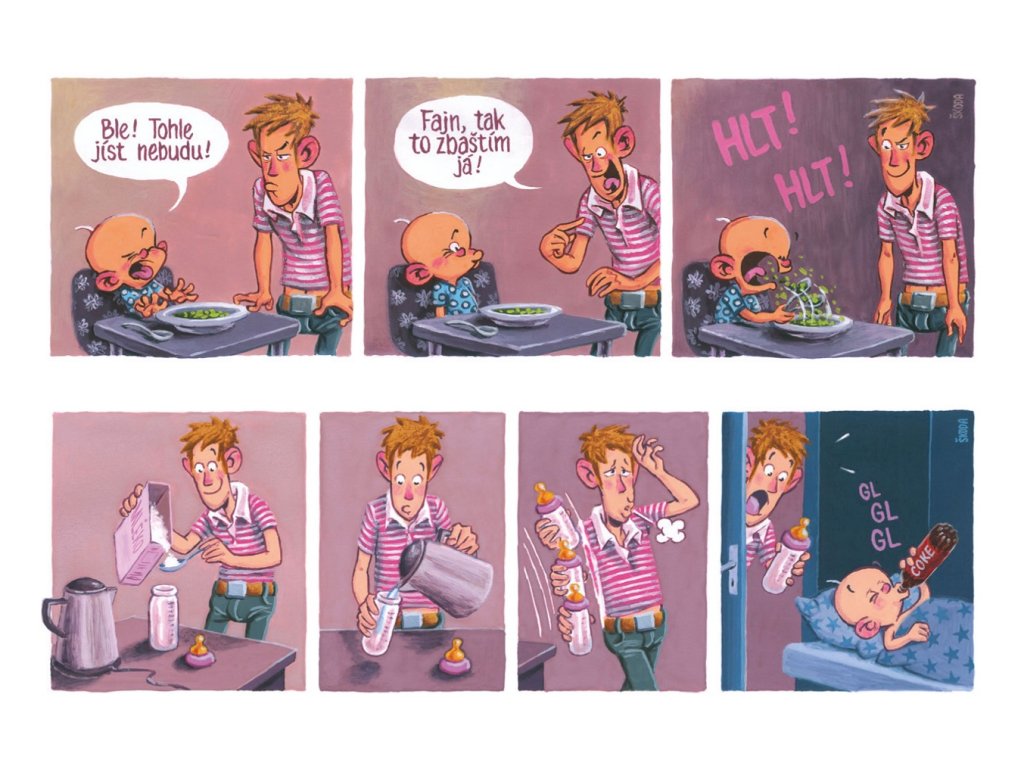 Můj táta a já jsme vážně v pohodě. Fakticky. Když se nudím, zakřičím a on hned přiběhne s lahvičkou a začne kolem tancovat. Občas mě uspává v autě a přitom mluví cizími jazyky, hlavně když zprudka zabrzdí mně pro radost. Někdy zkouším po něm opakovat a on vždycky zčervená pýchou! Táta je taky dobrý sportovec a já mu v tom pomáhám. Odhodím dudlík a on skáče do dálky, nebo spolknu korunu a on trénuje sprint k doktorovi. Tenhle týden jsme si to dali třikrát. Myslím, že si zlepšil čas. Vážně je skvělý!