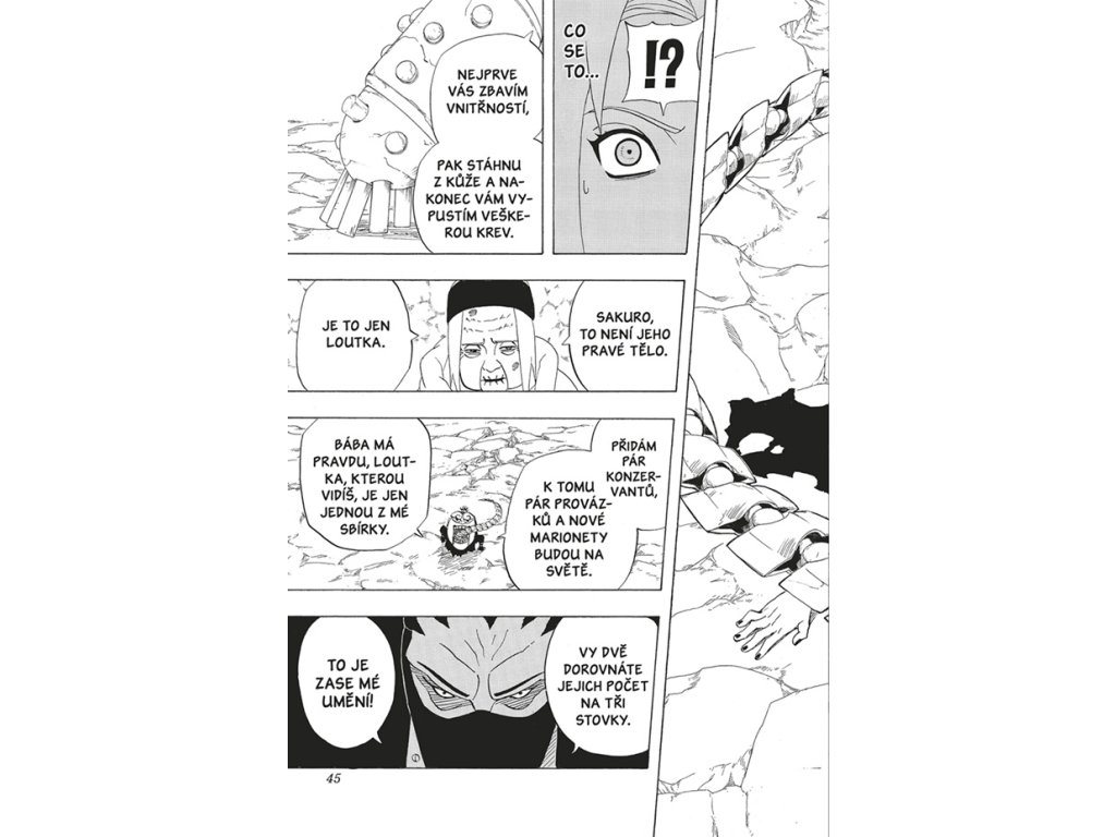 Přátelé z Konohy konečně dosáhli jeskyně, ve které Akacuki provedli rituál odebrání démona z těla Gaary, Kazekageho Skryté písečné. Dokončení rituálu se nepodařilo zabránit a Kakašiho tým je navíc znovu rozdělen – zatímco Naruto s Kakašim pronásledují Deidaru, který prchá s Gaarovým tělem, babi Čijo se Sakurou po boku se musí postavit dalšímu z Akacuki – zrádci Písečné, svému vnukovi Sasorimu. Proti sobě tak stojí mladický zápal doplněný věkovitými zkušenostmi a vražedná účelnost, která se nezastaví před ničím.