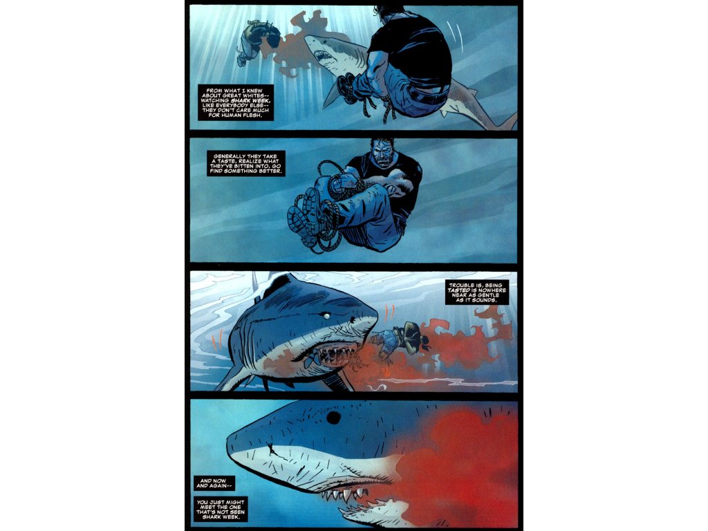 Frank Castle has definitely seen better days. Beaten to within an inch of his life, then handcuffed and tossed into the Deep Blue Sea, he’s got a Great White bearing down on him. If he’s going to survive, he’s going to have to think quick. And then he’s got to worry about who’s waiting for him on the surface: The Barracuda. And he can’t wait for Round Two.