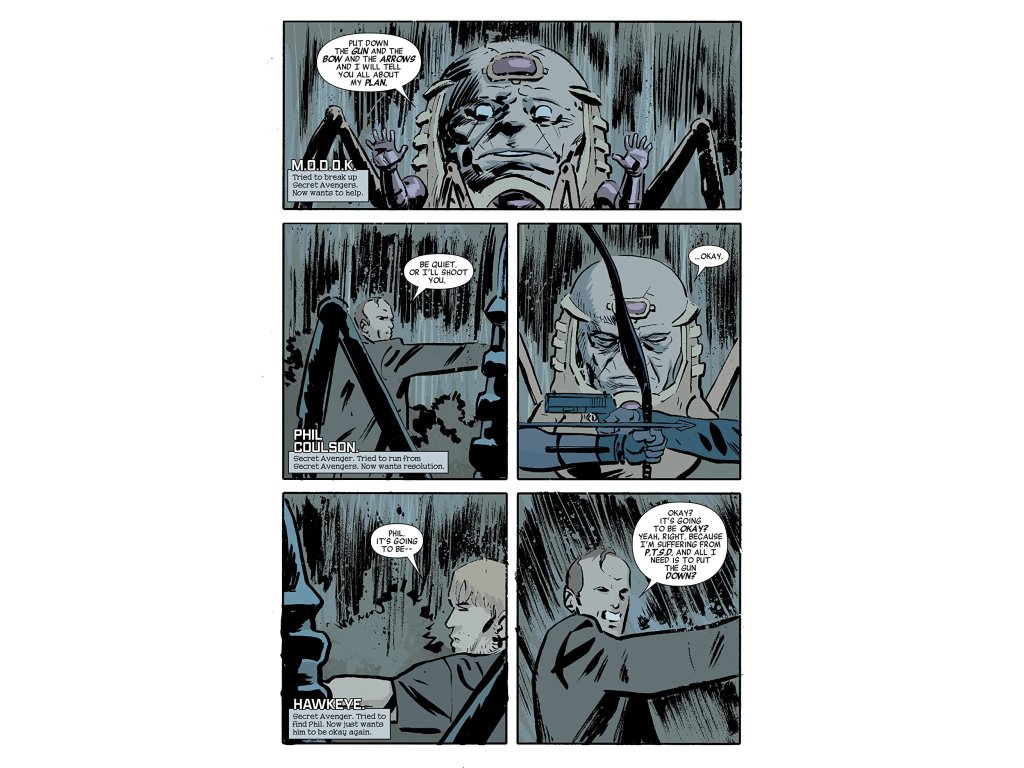 Hawkeye and Coulson face off. Who survives? Why is this even happening? Vladimir makes a deal with the Fury. Is this a good thing? Is this a bad thing? We won't tell! But you'll find out. Helicarrier is under attack. Spider-Woman engages. M.O.D.O.K. gets the message.
