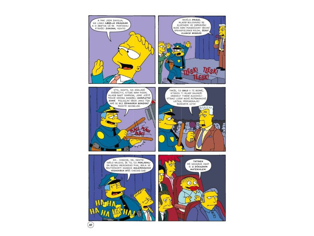 Hej, vítejte na pravé vesnické komiksové merendě! Připněte si pevně kšandy, nasaďte si holínky a rovnou do toho šlápněte! Homer se nám tu pustí do křížku se starostou Quimbym... když sám začne kandidovat! Bart se s kámoši rozhodne založit vlastní chlapeckou skupinu. Dívčí srdce budou v bezpečí – jejich ušní bubínky ne. Smithers začne obhospodařovat Homera a Bart se pustí do pravé bulvární novinařiny (jdi se zahrabat, Blesku).