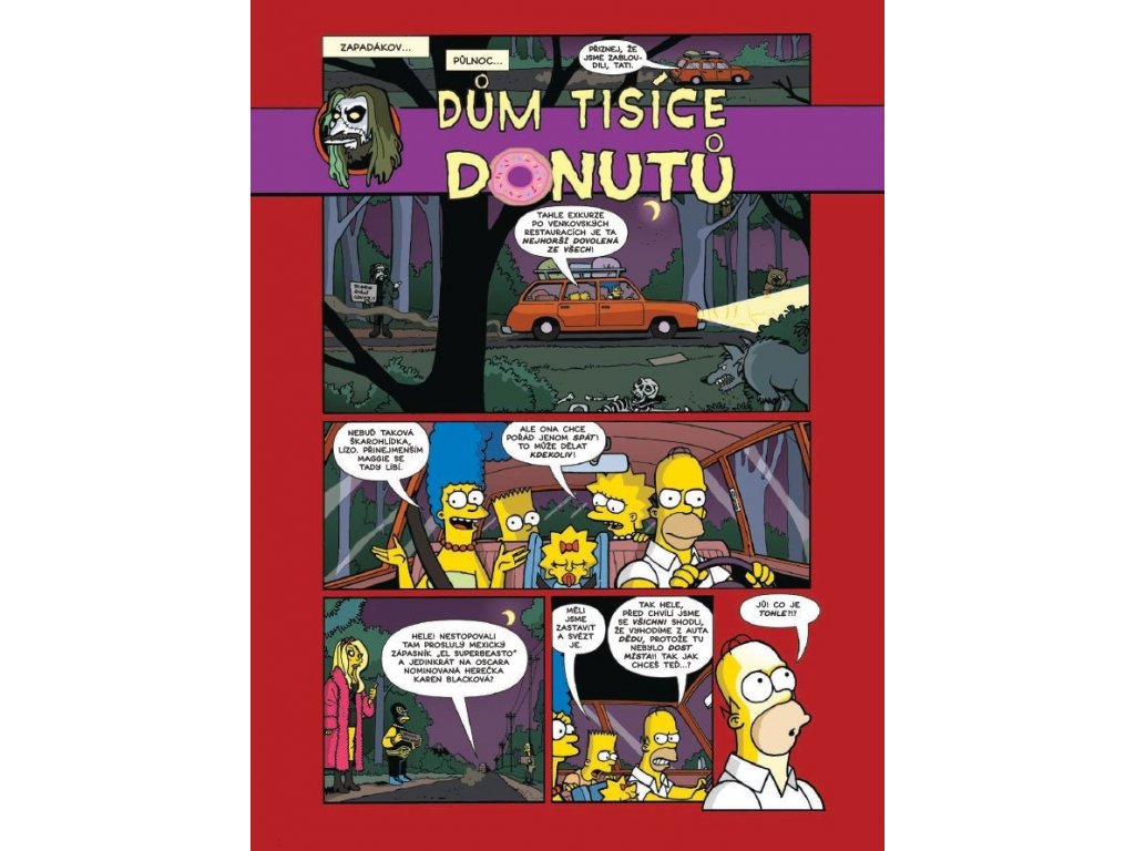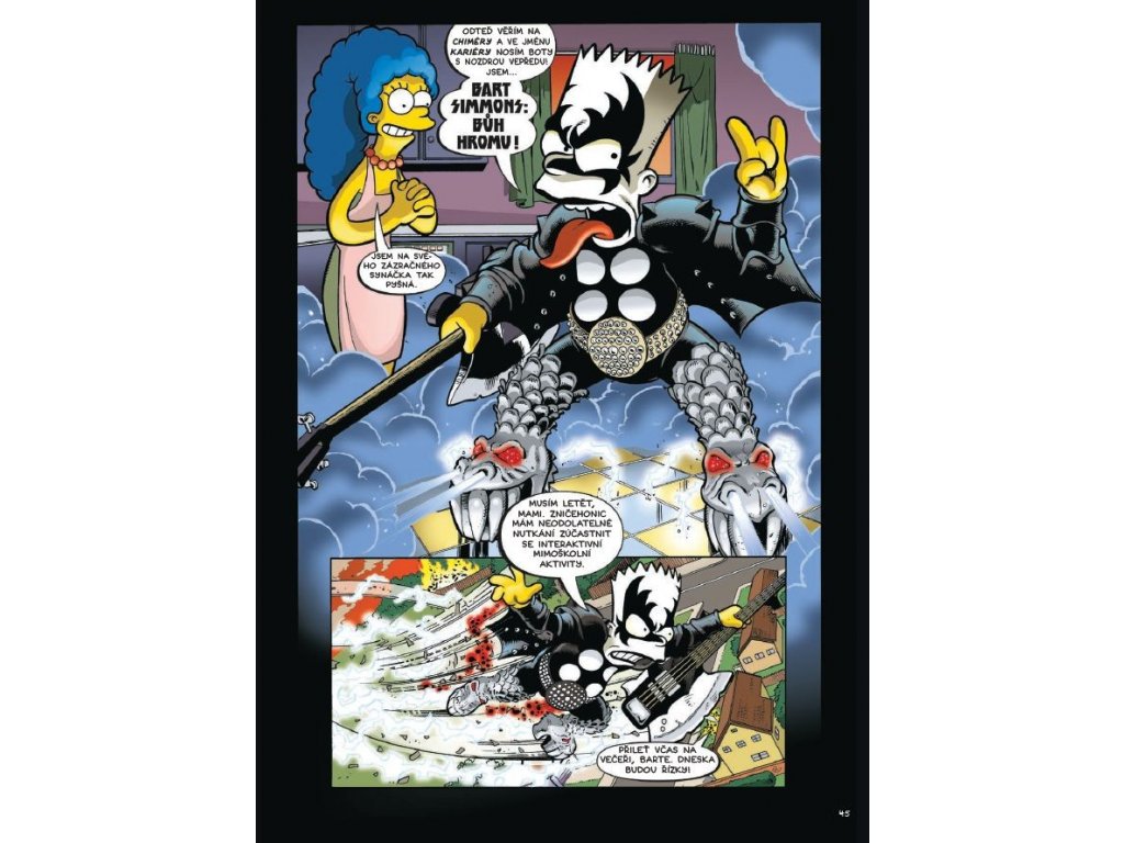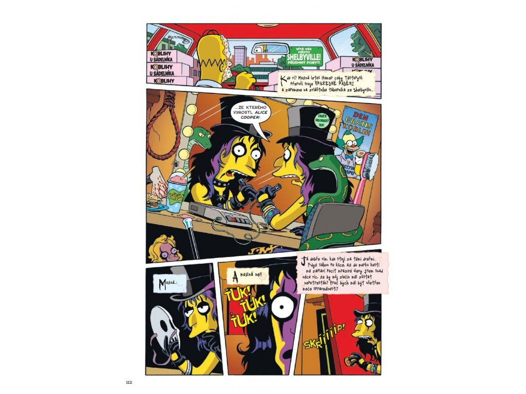Mistr megavtipných masakrů Matt Groening se vydává s matadory rocku (Alice Cooper, Gene Simmons a Rob Zombie) na heavymetalovou halloweenskou rokenrolovou odyseu, kde máničky hází hlavou, vyplazují jazyky a vyvolávají smrtelný strach a skandály. Dokonce i Pat Boone, „pan slušný“, se dostane do rokenrolové ráže v pošahaném příběhu o děsivých démonech a spravedlivé spáse. Ať se již ponoříte do koblihového těsta nebo strašidelného města, čeká vás bohatá koleda v podobě komiksové kolekce, v níž nechybí pekelní potomci metající blesky, opice ohánějící se motorovou pilou, televize terorizující diváky, hrůzyplné historky z křesťanského tábora, příšery z ledové tříště s limetkovou příchutí, záchody zatracenců, upíří hrobky, uhranutí a zvláštní pocta nakladatelství EC Comics, průkopníkům vtipného a napínavého komiksového vyprávění. Tenhle halloweenský nářez století vám vygumuje mozek a vyšisuje duši!