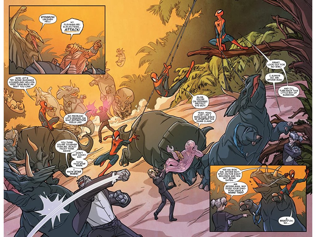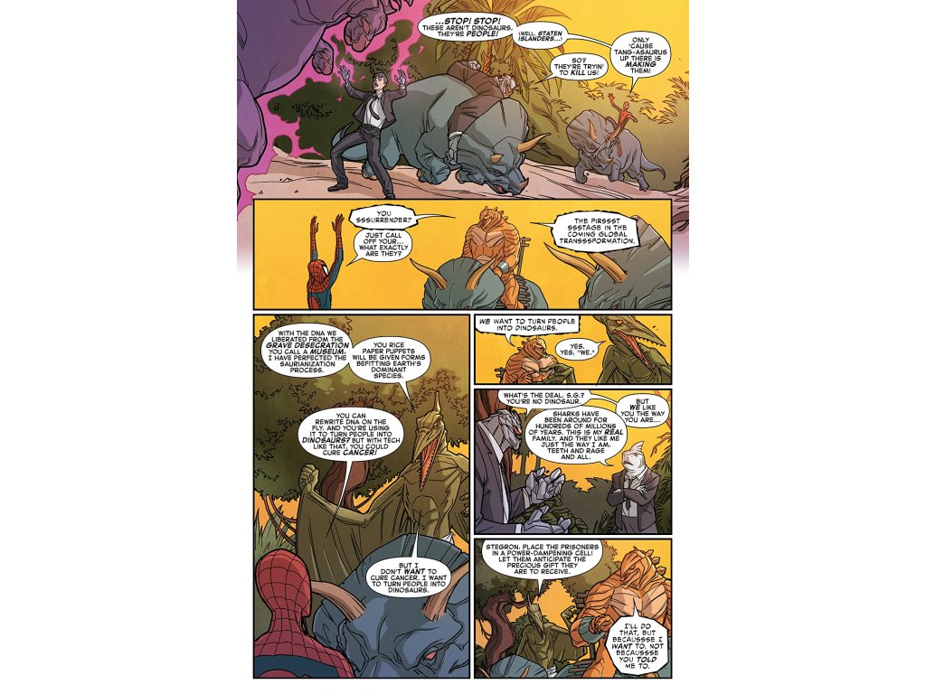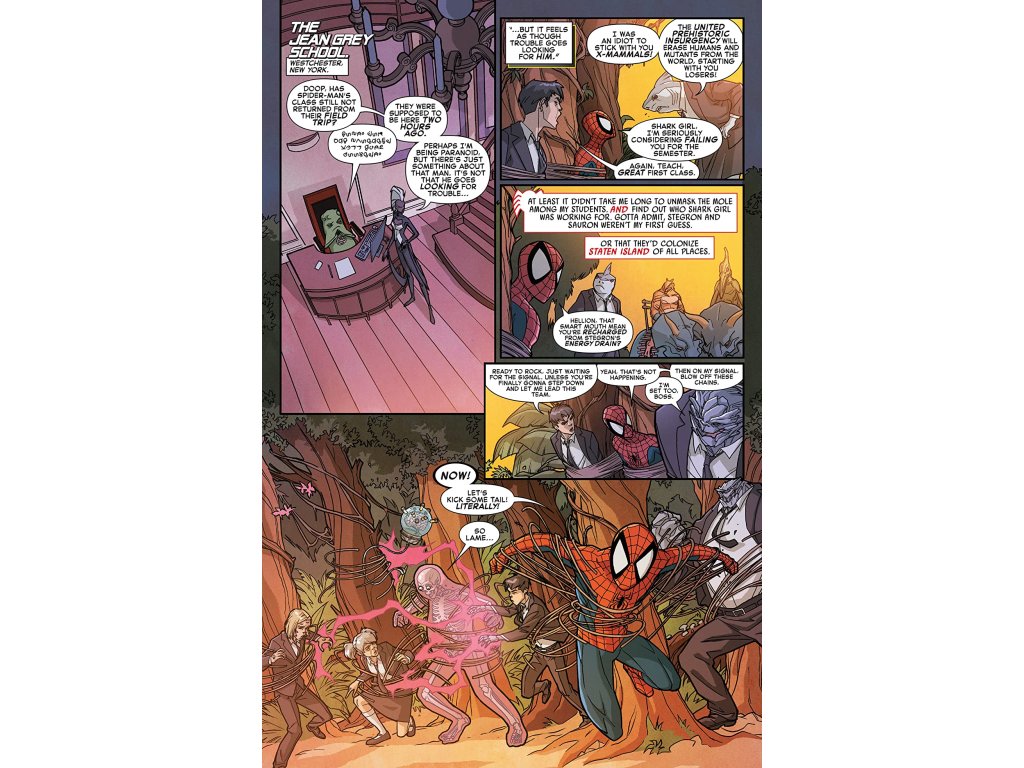 Bad Teacher! Spidey's already gotten his X-students captured by Sauron and Stegron! Can they stop the Savage Land from colonizing Staten Island? Traitor! Has Shark Girl really betrayed her classmates for these cold-blooded creeps? Romance! Have you ever seen a pteranodon/stegosaurus/shark love triangle? You will if you read this issue!
