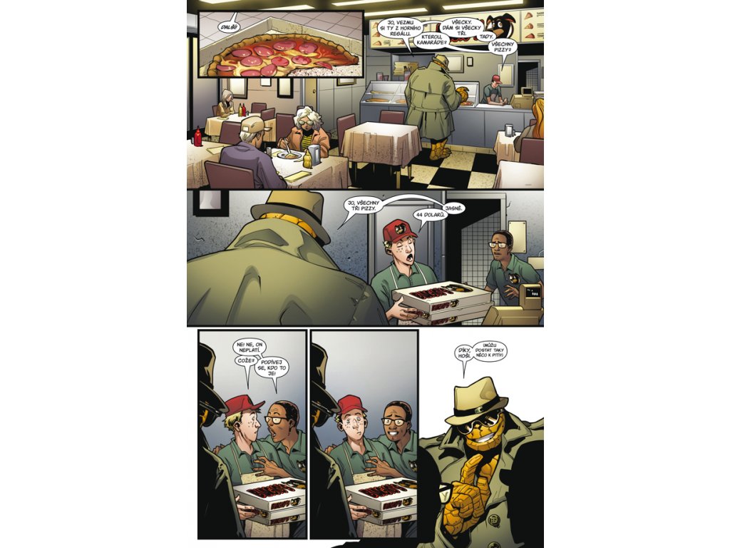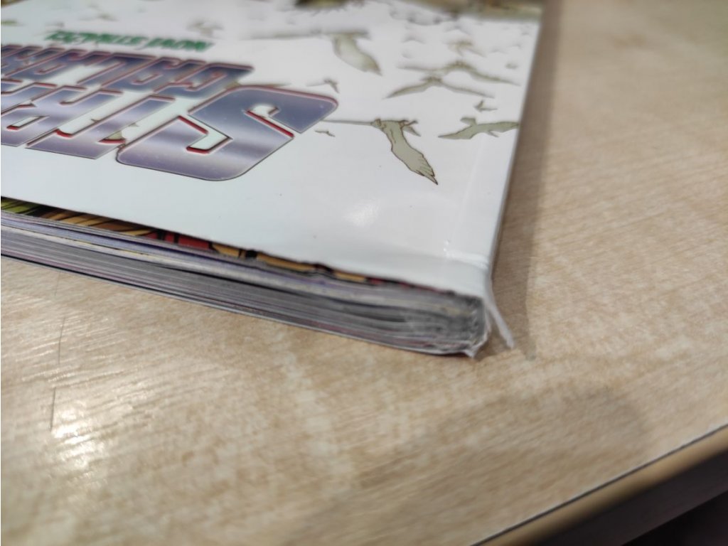 Komiks má natržený hřbet a ohnutou obálku u vrchu.