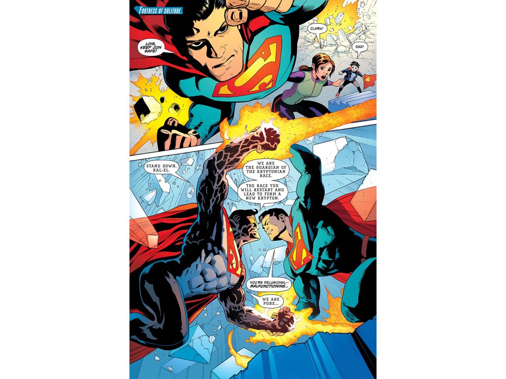 “SON OF SUPERMAN” part four! The battle for Jon hits Metropolis as the Eradicator targets Superman’s son! Can the Man of Steel protect the city and his son against the Kryptonian executioner-or will he have to make a sacrifice?