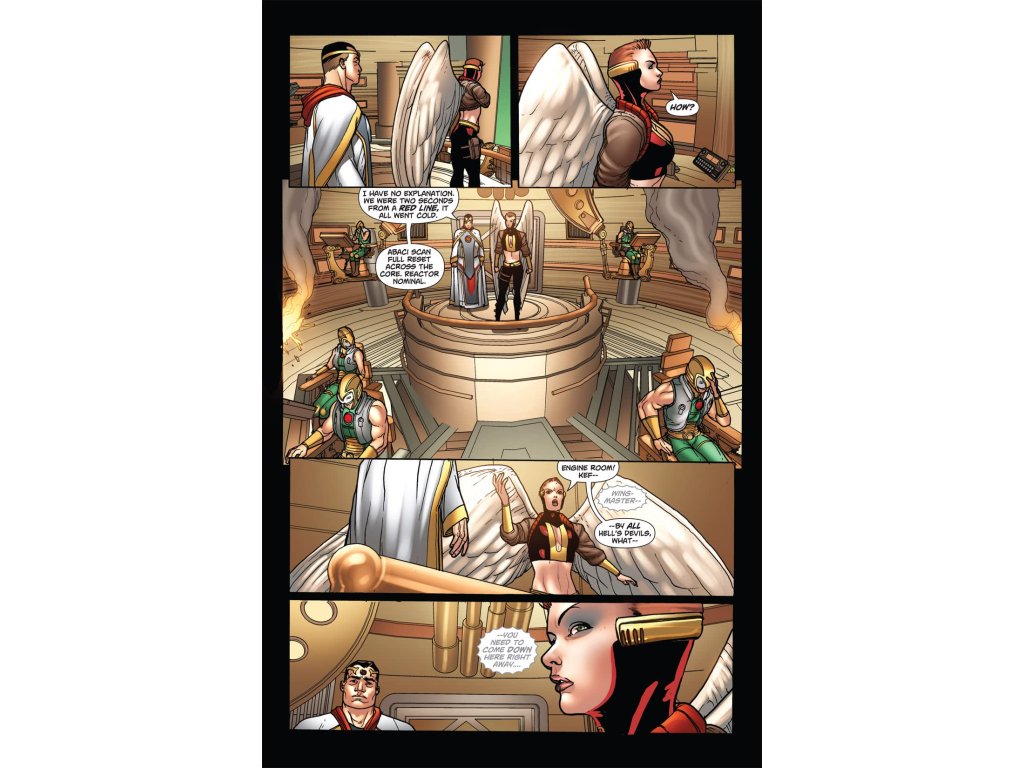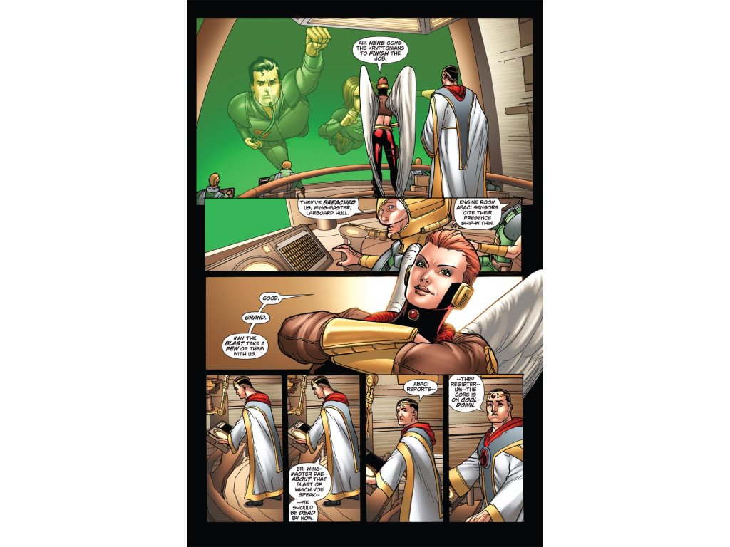 The Thanagarian fleet continues their attack against the kryptonians and after Superman and Red Shard stop their mothership from exploding the Wing Commanders hears them out and the battle ends peacefully.