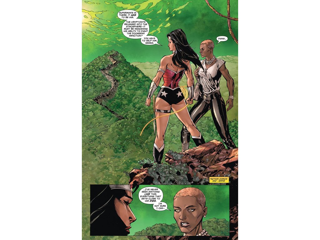 "Superman: Doomed!" part 7, continued from Action Comics (2011-) #32. As things get more dire on Earth for him, the Man of Steel may have to go into exile in space, but the self-proclaimed protectors of Sector 2814, and the Red Lanterns, don't want him there either. Continued in Action Comics (2011-) #33.