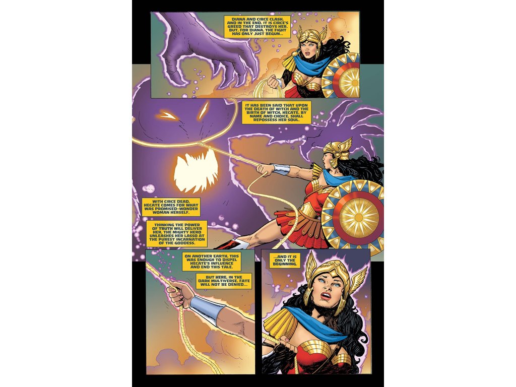 The realms of the gods have been turned upside down and inside out, on the verge of engulfing Earth and its people. Only one hero stands to defend it: Wonder Woman! But that is another world and another story. Behold the mirror image of this tale taking place in the Dark Multiverse, with a Wonder Woman who is ready to destroy it all! Cursed by the evil goddess of magic, Hecate, our beloved Diana has become a weapon of vengeance ready to tear down any god or superhero that stands in her way. Will Earth and its heroes survive her might? Or are they doomed to worship the dark princess of the Amazons for the rest of eternity?!