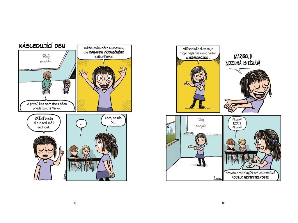Věříte, že existují jednorožci? Terka ano. Jak by taky ne, když jednoho z nich trefila kamenem do hlavy, když házela žabky u rybníka! Marigold Nozdra Božská dobře ví, že patří mezi nejkrásnější stvoření na celém světě, a navíc je i kouzelná, takže je tak trochu (vlastně docela dost) marnivá. Ale ač je to neuvěřitelné, toto do sebe zahleděné mýtické stvoření a bystré energické děvče s velkou fantazií a běžnými problémy se stanou nejlepšími kamarádkami. Budou si hrát na nepřemožitelné hrdinky, půjdou na pyžamový večírek, budou sbírat holčičí drby a létat s větrem o závod. Jednoduše to bude ohromná jízda plná legrace – a to i přesto, že Terku spolužačky nazvou exotem a Princeznou Hlupačkou po sto padesáté první.