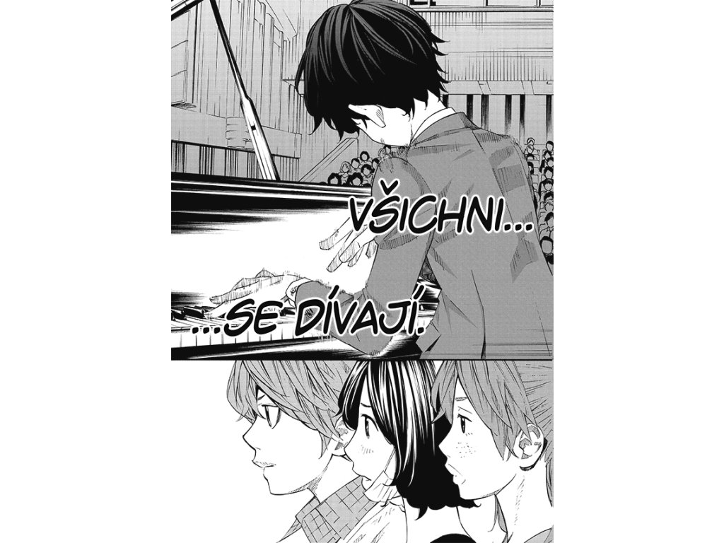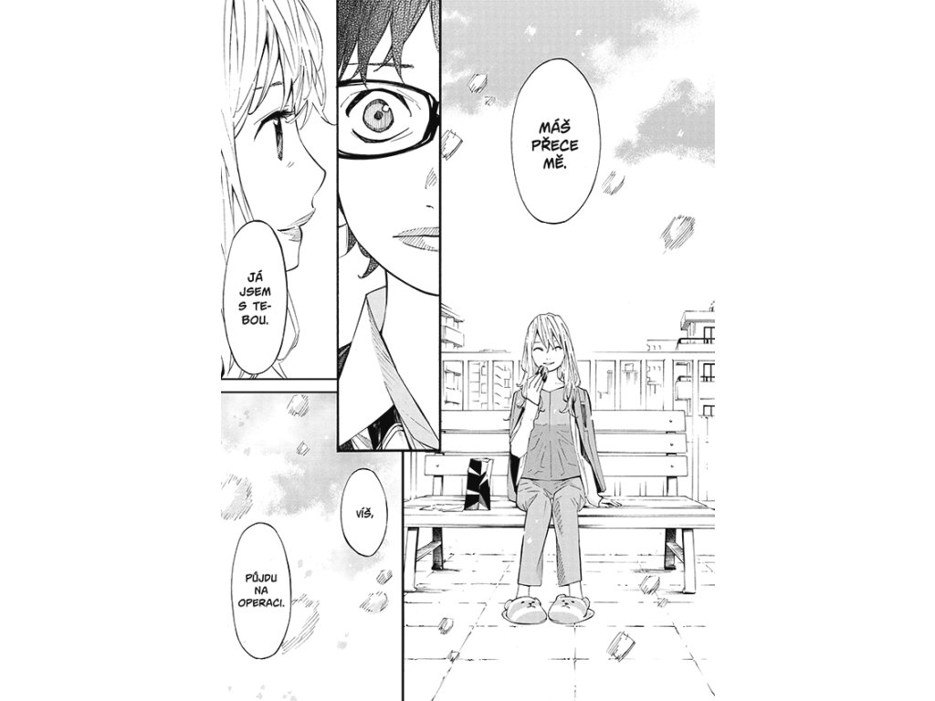 Kósei si konečně připustil, že je do Kaori zamilovaný, a Kaori se pomocí rehabilitace snaží nabrat síly, aby znovu mohla koncertovat. Jenže přání i prosby vycházejí naprázdno a její nemoc se horší… Zvládne Kósei za téhle situace vystoupit na důležité soutěži?