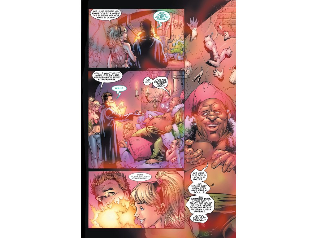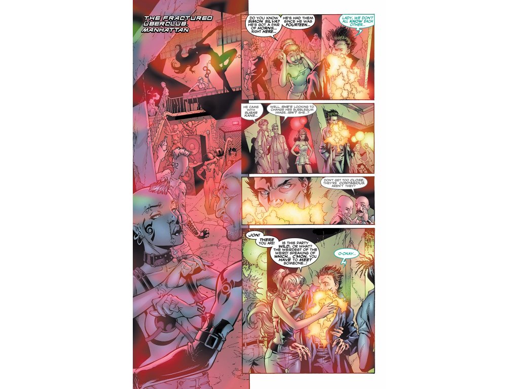 Sugar takes Chamber to the fractured Überclub in Manhattan. While she enjoys partying, Jon is met with the same prejudices as before, some people are suspicious of him or think he might have a contagious disease, others ask him about other mutants as if all mutants worldwide would know each other. Finally Sugar introduces him to Colby Lee, an extraordinaire performance artist. Lee is happy to met Chamber in person, actually he is reminded of his own work; he uses various doll bodyparts for his art, one of them being the upper half of a face. Later Sugar and Jono fly back to London. Kurt, Logan and Bobby are in a pub. Nightcrawler is not in the mood to use his image inducer and the other customers are staring as he drinks his beer while hanging from the ceiling. Logan informs them about...