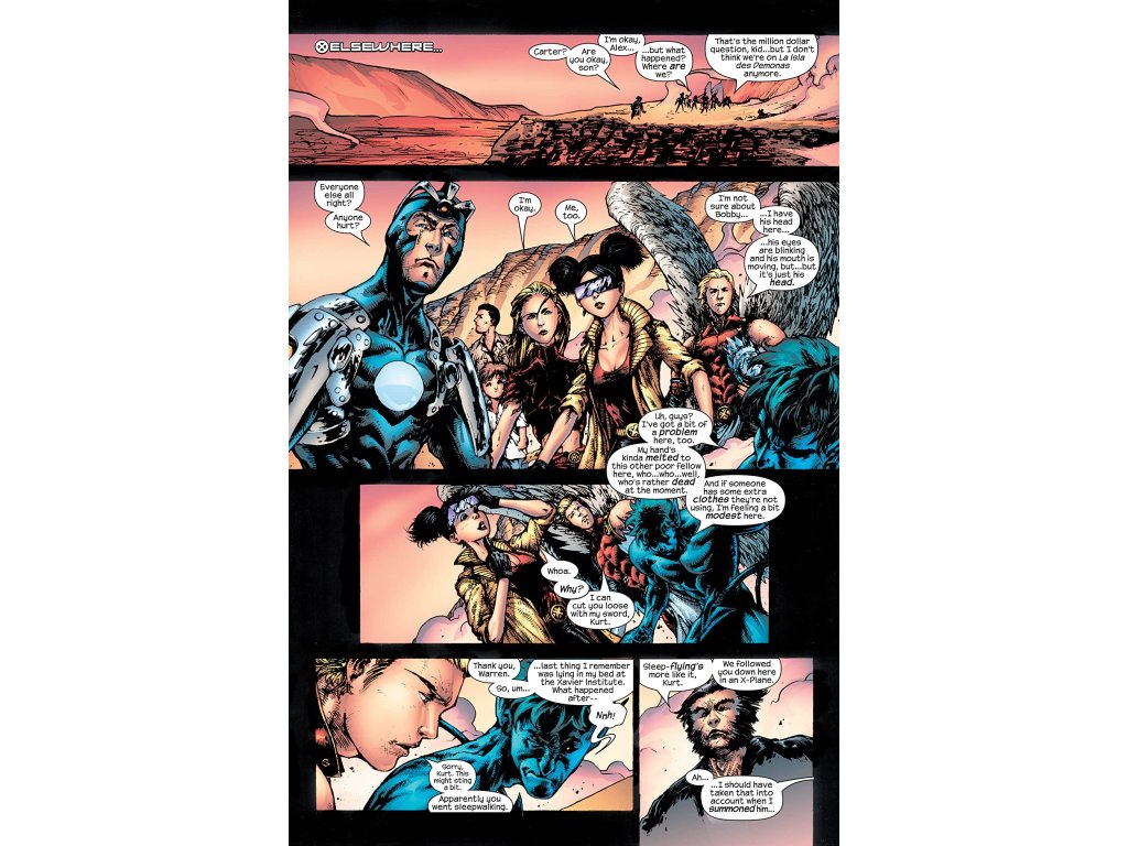 The X-Men battle Azazel’s horde, Lorna relives the massacre at Genosha and Northstar and Juggernaut have a frank discussion aboard the X-Jet on their way to see Squidboy.