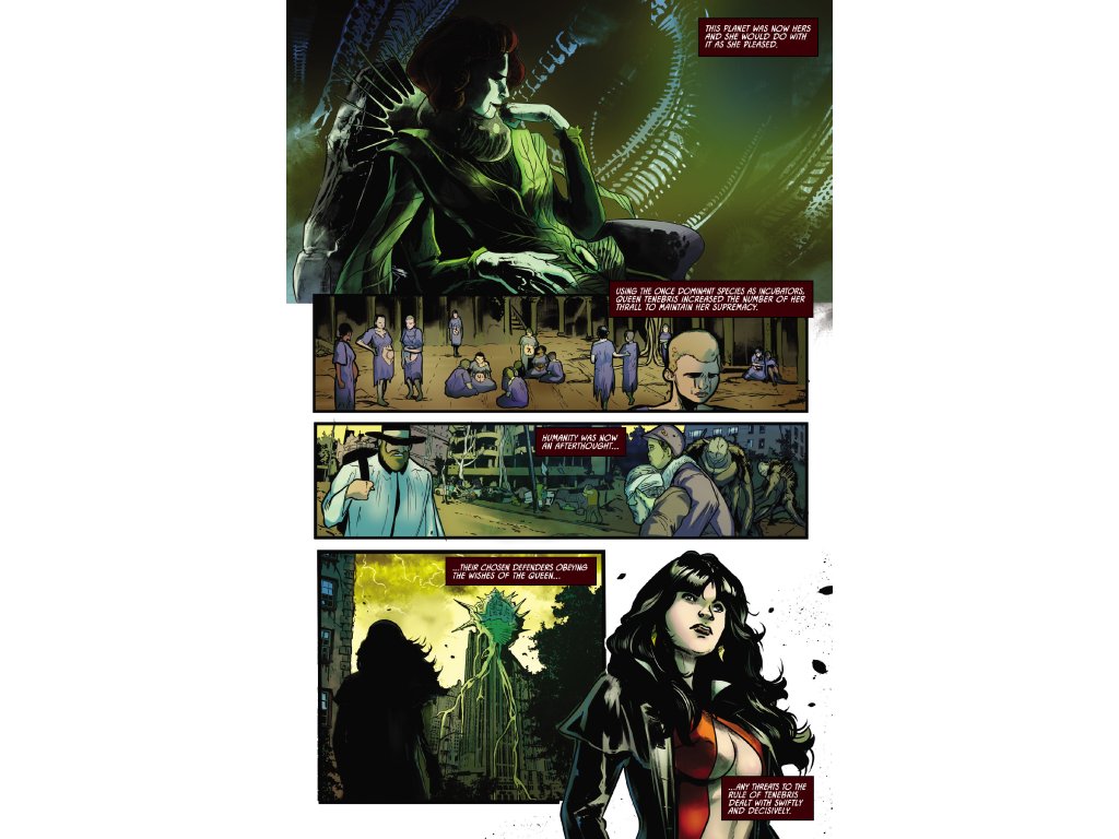 Captured on her chaos-combatting mission for the Reality Corporation, Lilith is now a prisoner of Tenebris, Queen of the planet-ruling Monstrum, who wants to know the identity of this mysterious woman who fell from the sky into the claws of her insect warriors. To find out, she sends her twisted dimension's Vampirella to investigate. The broken Vampirella uncovers the truth about Lilith's alternate reality origins - something that the world-conquering Queen Tenebris is very interested in!