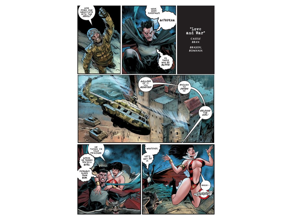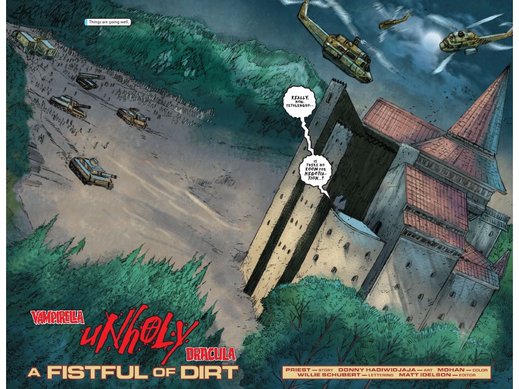 The honeymoon begins! The adventure of several lifetimes begins as Vampirella and new husband Matt journey to Castle Dracula in Transylvania in an attempt to cheat fate by preventing both a high-tech virus and an ancient curse from using Matt's body to resurrect the deadliest threat the world has ever known. Meanwhile secrets and mystery grow around Vampi's spouse, who may not be nearly as innocent as he appears to be. Join us for this new series debut by twice-bitten writer Christopher Priest and bloodthirsty artist Donny Hadiwidjaja!