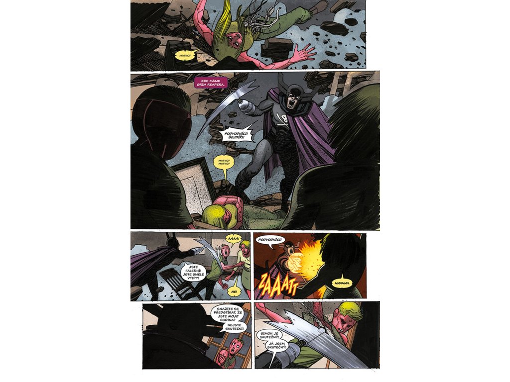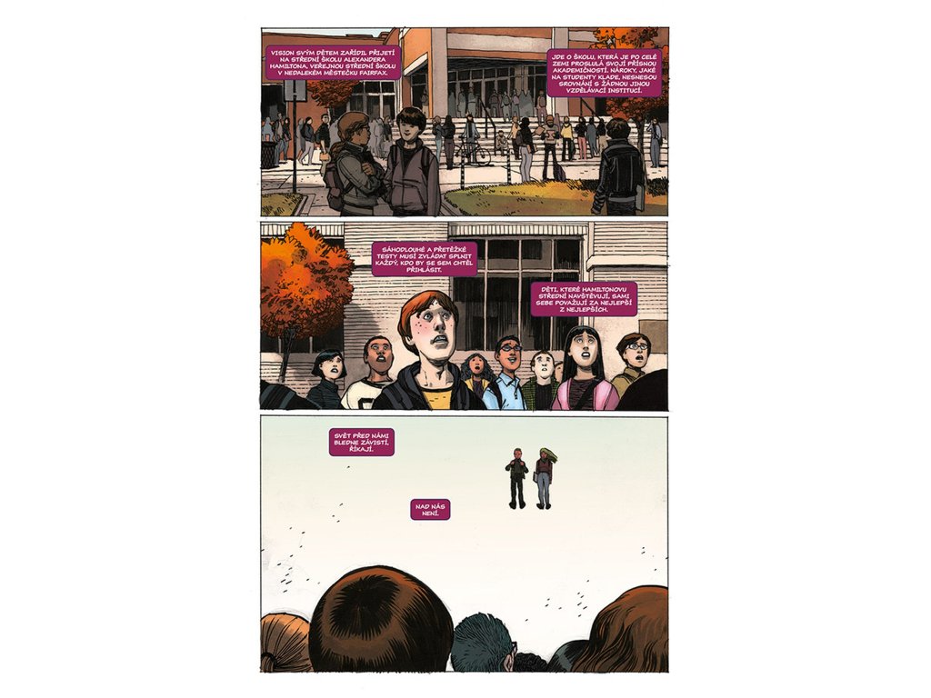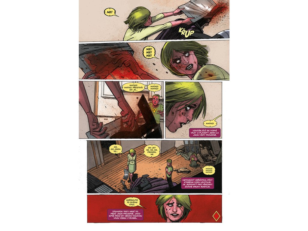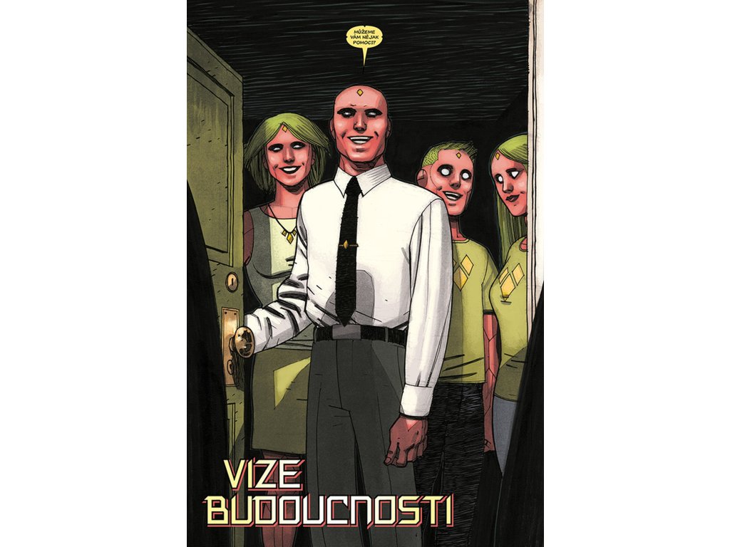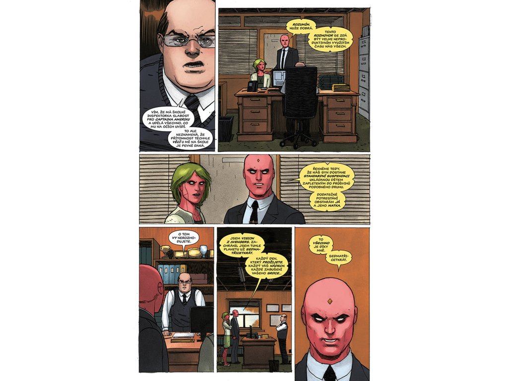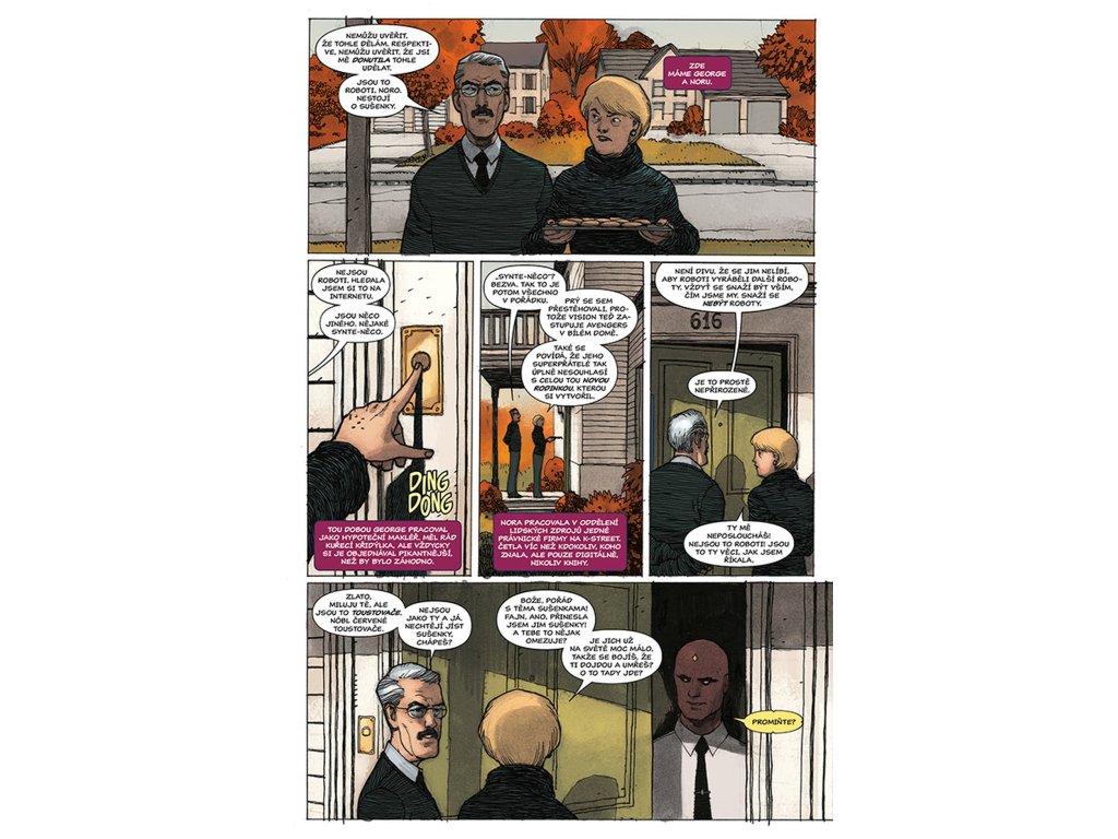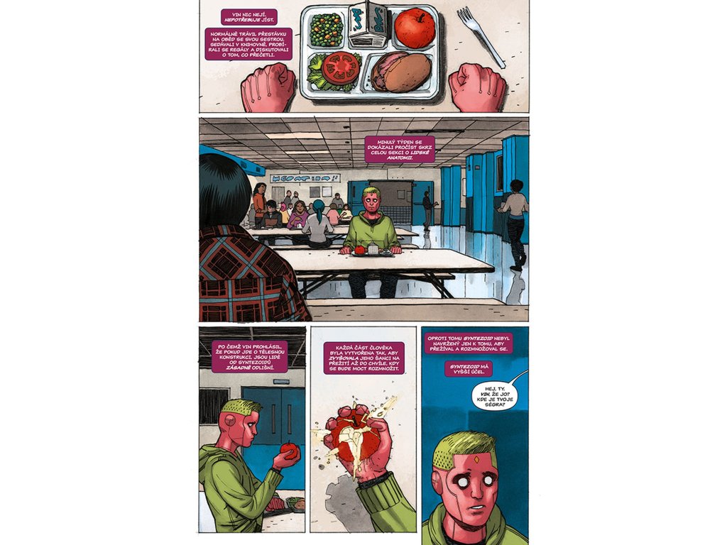 VISION chce být jako člověk, a co je víc lidského než rodina? Proto se vrací zpátky tam, kde to všechno začalo. Do laboratoře, kde mu dal Ultron život a přeměnil jej ve zbraň. Do místa, kde se poprvé vzepřel předurčenému osudu a uvědomil si, že by mohl být něčím víc – že by mohl být člověkem. Právě zde je tedy stvořil. Virginii, manželku. Viv a Vina, dvojčata v pubertě. Vypadají jako on. Mají i stejné superschopnosti. A sdílí také jeho největší touhu (nebo je to posedlost?): neutuchající potřebu být zcela obyčejnými lidmi. Jsou to prostě jen sousedi odvedle, akorát nás můžou kdykoliv všechny zabít. Tak žádné obavy, vždyť co by se mohlo stát? Připravte se na zlomená umělá srdce, těla, která nezůstanou pohřbena, pravdu, jež bude odhalena... a na Visiona, který se navždycky změní.