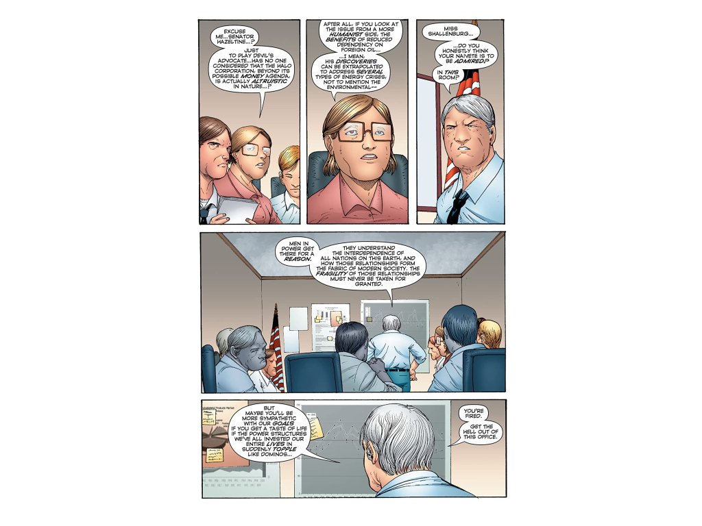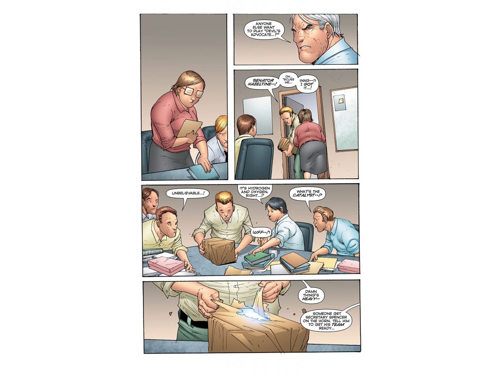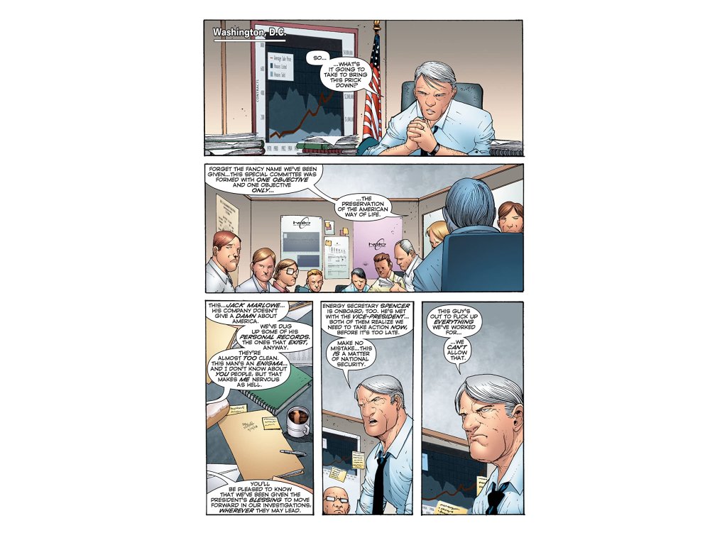 Senator Basil Hazeltine organizes a "special committee" in investigating Jack Marlowe and the Halo Corporation. Agent Wax catches wind of the committee's investigation while still posing as Agent Downs by hearing from a drunken department head, including learning from irate oil lobbyists and automakers who see Halo jeopardizing their revenue and economy. Wax calls and warns Marlowe about this and also informs him that the National Park Service's mainframe was hacked to find any incrimination on Marlowe - which they didn't - and about superpowered assassins which Wax fears that Marlowe's enemies will come after him.