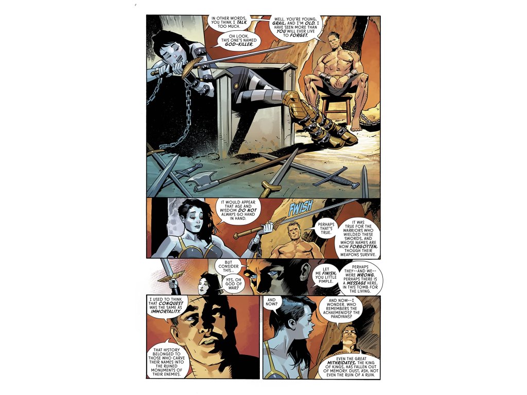 Far below Themyscira, Ares, the God of War, has been imprisoned for generations, repenting his past sins. But his new cellmate Grail may have an unexpected effect on him...and the plan they’ve come up with will change Themyscira—and the world— forever! When Wonder Woman rushes to Eastern Europe to rescue Steve Trevor from a mission gone wrong, she’ll find herself face-to-face with a very new, very different God of War!
